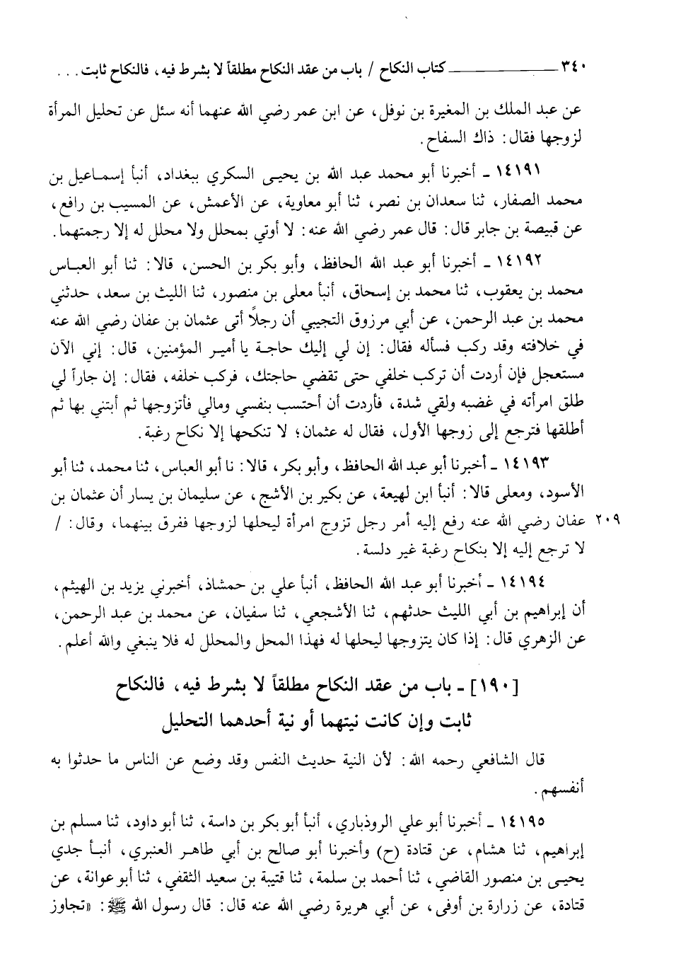 14192 - أَخْبَرَنَا أَبُو عَبْدِ اللهِ الْحَافِظُ، وَأَبُو بَكْرِ بْنُ الْحَسَنِ قَالَا: ثنا أَبُو الْعَبَّاسِ مُحَمَّدُ بْنُ يَعْقُوبَ، ثنا مُحَمَّدُ بْنُ إِسْحَاقَ، أنبأ مُعَلَّى بْنُ مَنْصُورٍ، ثنا اللَّيْثُ بْنُ سَعْدٍ، حَدَّثَنِي مُحَمَّدُ بْنُ عَبْدِ الرَّحْمَنِ، عَنْ أَبِي مَرْزُوقٍ التُّجِيبِيِّ، أَنَّ رَجُلًا أَتَى عُثْمَانَ بْنَ عَفَّانَ رَضِيَ اللهُ عَنْهُ فِي خِلَافَتِهِ وَقَدْ رَكِبَ فَسَأَلَهُ فَقَالَ: إِنَّ لِي إِلَيْكَ حَاجَةً يَا أَمِيرَ الْمُؤْمِنِينَ قَالَ: إِنِّي الْآنَ مُسْتَعْجِلٌ فَإِنْ أَرَدْتَ أَنْ تَرْكَبَ خَلْفِي حَتَّى تَقْضِيَ حَاجَتَكَ , فَرَكِبَ خَلْفَهُ فَقَالَ: إِنَّ جَارًا لِي طَلَّقَ امْرَأَتَهُ فِي غَضَبِهِ وَلَقِيَ شِدَّةً، فَأَرَدْتُ أَنْ أَحْتَسِبَ بِنَفْسِي وَمَالِي فَأَتَزَوَّجُهَا ثُمَّ أَبْتَنِي بِهَا ثُمَّ أُطَلِّقُهَا فَتَرْجِعُ إِلَى زَوْجِهَا الْأَوَّلِ , فَقَالَ لَهُ عُثْمَانُ: §" لَا تَنْكِحْهَا إِلَّا نِكَاحَ رَغْبَةٍ "