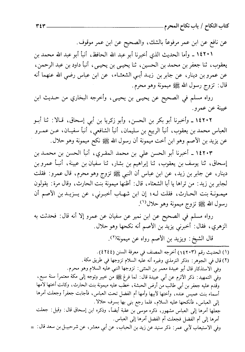 14203 - أَخْبَرَنَا أَبُو الْحَسَنِ عَلِيُّ بْنُ مُحَمَّدٍ الْمُقْرِئُ , أنبأ الْحَسَنُ بْنُ مُحَمَّدِ بْنِ إِسْحَاقَ، ثنا يُوسُفُ بْنُ يَعْقُوبَ، ثنا إِبْرَاهِيمُ بْنُ بَشَّارٍ، ثنا سُفْيَانُ بْنُ عُيَيْنَةَ، أنبأ عَمْرُو بْنُ دِينَارٍ، عَنْ جَابِرِ بْنِ زَيْدٍ، عَنِ ابْنِ عَبَّاسٍ، أَنَّ النَّبِيَّ صَلَّى اللهُ عَلَيْهِ وَسَلَّمَ " §تَزَوَّجَ وَهُوَ مُحْرِمٌ " , قَالَ عَمْرٌو: فَقُلْتُ لِجَابِرِ بْنِ زَيْدٍ: مَنْ تَرَاهَا يَا أَبَا الشَّعْثَاءِ؟ قَالَ: أَظُنُّهَا مَيْمُونَةَ بِنْتَ الْحَارِثِ , وَقَالَ مَرَّةً: يَقُولُونَ: مَيْمُونَةُ بِنْتُ الْحَارِثِ , فَقُلْتُ لَهُ: إِنَّ ابْنَ شِهَابٍ أَخْبَرَنِي , عَنْ يَزِيدَ بْنِ الْأَصَمِّ أَنَّ رَسُولَ اللهِ صَلَّى اللهُ عَلَيْهِ وَسَلَّمَ تَزَوَّجَ مَيْمُونَةَ وَهُوَ حَلَالٌ , رَوَاهُ مُسْلِمٌ فِي الصَّحِيحِ، عَنِ ابْنِ نُمَيْرٍ عَنْ سُفْيَانَ عَنْ عَمْرٍو إِلَّا أَنَّهُ قَالَ: فَحَدَّثْتُ بِهِ الزُّهْرِيَّ فَقَالَ: أَخْبَرَنِي يَزِيدُ بْنُ الْأَصَمِّ أَنَّهُ " نَكَحَهَا وَهُوَ حَلَالٌ " قَالَ الشَّيْخُ: يَزِيدُ بْنُ الْأَصَمِّ رَوَاهُ عَنْ مَيْمُونَةَ