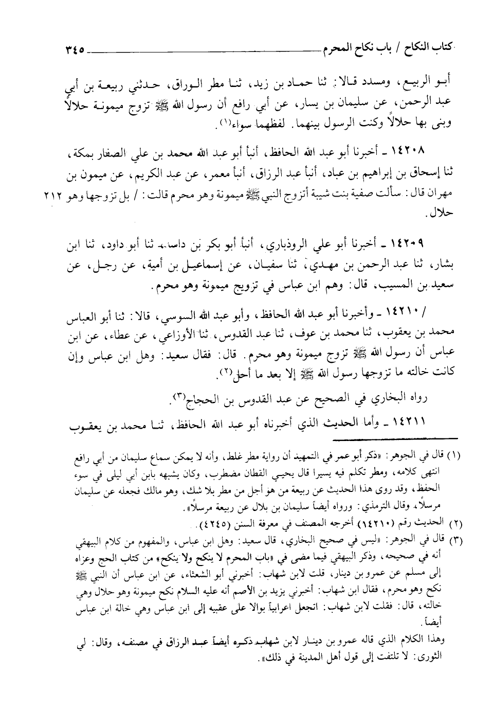 14208 - أَخْبَرَنَا أَبُو عَبْدِ اللهِ الْحَافِظُ، أنبأ أَبُو عَبْدِ اللهِ مُحَمَّدُ بْنُ عَلِيٍّ الصَّفَّارُ بِمَكَّةَ , ثنا إِسْحَاقُ بْنُ إِبْرَاهِيمَ بْنِ عَبَّادٍ، أنبأ عَبْدُ الرَّزَّاقِ، أنبأ مَعْمَرٌ، عَنْ عَبْدِ الْكَرِيمِ، عَنْ مَيْمُونِ بْنِ مِهْرَانَ قَالَ: سَأَلْتُ صَفِيَّةَ بِنْتَ شَيْبَةَ: أَتَزَوَّجَ النَّبِيُّ صَلَّى اللهُ عَلَيْهِ وَسَلَّمَ مَيْمُونَةَ وَهُوَ مُحْرِمٌ؟ قَالَتْ: §" بَلْ تَزَوَّجَهَا وَهُوَ حَلَالٌ "