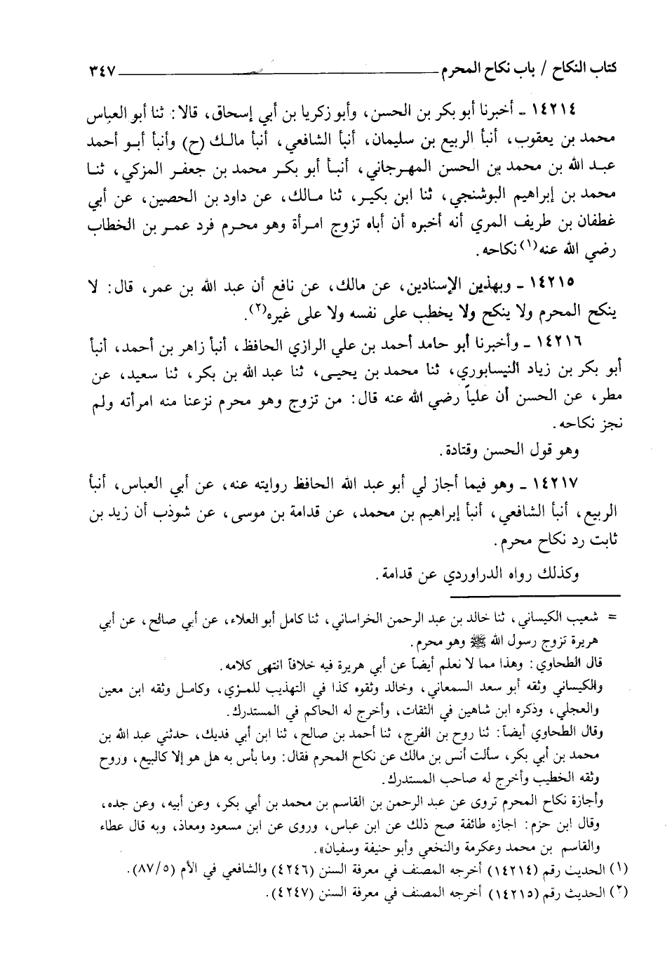 14214 - أَخْبَرَنَا أَبُو بَكْرِ بْنُ الْحَسَنِ، وَأَبُو زَكَرِيَّا بْنُ أَبِي إِسْحَاقَ قَالَ: ثنا أَبُو الْعَبَّاسِ مُحَمَّدُ بْنُ يَعْقُوبَ، أنبأ الرَّبِيعُ بْنُ سُلَيْمَانَ، أنبأ الشَّافِعِيُّ، أنبأ مَالِكٌ، ح وَأنبأ أَبُو أَحْمَدَ عَبْدُ اللهِ بْنُ مُحَمَّدِ بْنِ الْحَسَنِ الْمِهْرَجَانِيُّ، أنبأ أَبُو بَكْرٍ مُحَمَّدُ بْنُ جَعْفَرٍ الْمُزَكِّي ثنا مُحَمَّدُ بْنُ إِبْرَاهِيمَ الْبُوشَنْجِيُّ، ثنا ابْنُ بُكَيْرٍ، ثنا مَالِكٌ، عَنْ دَاوُدَ بْنِ الْحُصَيْنِ، عَنْ أَبِي غَطَفَانَ بْنِ طَرِيفٍ الْمُرِّيِّ، أَنَّهُ أَخْبَرَهُ، أَنَّ أَبَاهُ §تَزَوَّجَ امْرَأَةً وَهُوَ مُحْرِمٌ، " فَرَدَّ عُمَرُ بْنُ الْخَطَّابِ رَضِيَ اللهُ عَنْهُ نِكَاحَهُ "