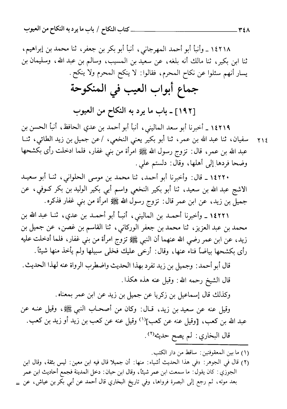 14221 - وَأَخْبَرَنَا أَحْمَدُ بْنُ مُحَمَّدٍ الْمَالِينِيِّ، أنبأ أَبُو أَحْمَدَ بْنُ عَدِيٍّ، ثنا عَبْدُ اللهِ بْنُ مُحَمَّدِ بْنِ عَبْدِ الْعَزِيزِ، ثنا مُحَمَّدُ بْنُ جَعْفَرٍ الْوَرْكَانِيُّ، ثنا الْقَاسِمُ بْنُ غُصْنٍ، عَنْ جَمِيلِ بْنِ زَيْدٍ، عَنِ ابْنِ عُمَرَ رَضِيَ اللهُ عَنْهُمَا أَنَّ النَّبِيَّ صَلَّى اللهُ عَلَيْهِ وَسَلَّمَ " §تَزَوَّجَ امْرَأَةً مِنْ بَنِي غِفَارٍ، فَلَمَّا أُدْخِلَتْ عَلَيْهِ رَأَى بِكَشْحِهَا بَيَاضًا فَنَاءَ عَنْهَا وَقَالَ: أَرْخِي عَلَيْكِ " , فَخَلَّى سَبِيلَهَا , وَلَمْ يَأْخُذْ مِنْهَا شَيْئًا قَالَ أَبُو أَحْمَدَ: وَجَمِيلُ بْنُ زَيْدٍ تَفَرَّدَ بِهَذَا الْحَدِيثِ , وَاضْطَرَبَ الرُّوَاةُ عَنْهُ لِهَذَا الْحَدِيثِ قَالَ الشَّيْخُ رَحِمَهُ اللهُ: وَقِيلَ عَنْهُ هَكَذَا. وَكَذَلِكَ قَالَ إِسْمَاعِيلُ بْنُ زَكَرِيَّا، عَنْ جَمِيلِ بْنِ زَيْدٍ، عَنِ ابْنِ عُمَرَ بِمَعْنَاهُ. وَقِيلَ عَنْهُ عَنْ سَعِيدِ بْنِ زَيْدٍ. قَالَ: وَكَانَ مِنْ أَصْحَابِ النَّبِيِّ صَلَّى اللهُ عَلَيْهِ وَسَلَّمَ , وَقِيلَ عَنْهُ عَنْ عَبْدِ اللهِ بْنِ كَعْبٍ , وَقِيلَ عَنْهُ عَنْ كَعْبٍ , وَقِيلَ عَنْهُ عَنْ كَعْبِ بْنِ زَيْدٍ , أَوْ زَيْدِ بْنِ كَعْبٍ , قَالَ الْبُخَارِيُّ: لَمْ يَصِحَّ حَدِيثُهُ