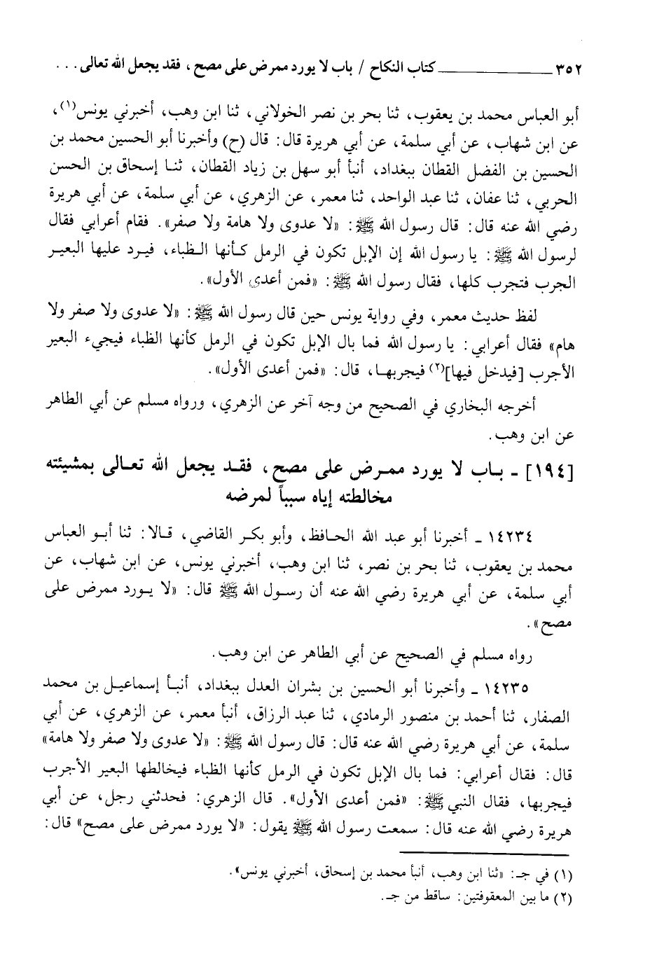 14234 - أَخْبَرَنَا أَبُو عَبْدِ اللهِ الْحَافِظُ، وَأَبُو بَكْرٍ الْقَاضِي , قَالَا: ثنا أَبُو الْعَبَّاسِ مُحَمَّدُ بْنُ يَعْقُوبَ، ثنا بَحْرُ بْنُ نَصْرٍ، ثنا ابْنُ وَهْبٍ، أَخْبَرَنِي يُونُسُ، عَنِ ابْنِ شِهَابٍ، عَنْ أَبِي سَلَمَةَ، عَنْ أَبِي هُرَيْرَةَ رَضِيَ اللهُ عَنْهُ أَنَّ رَسُولَ اللهِ صَلَّى اللهُ عَلَيْهِ وَسَلَّمَ قَالَ: §" لَا يُورِدُ مُمْرِضٌ عَلَى مُصِحٍّ " , رَوَاهُ مُسْلِمٌ فِي الصَّحِيحِ، عَنْ أَبِي الطَّاهِرِ عَنِ ابْنِ وَهْبٍ