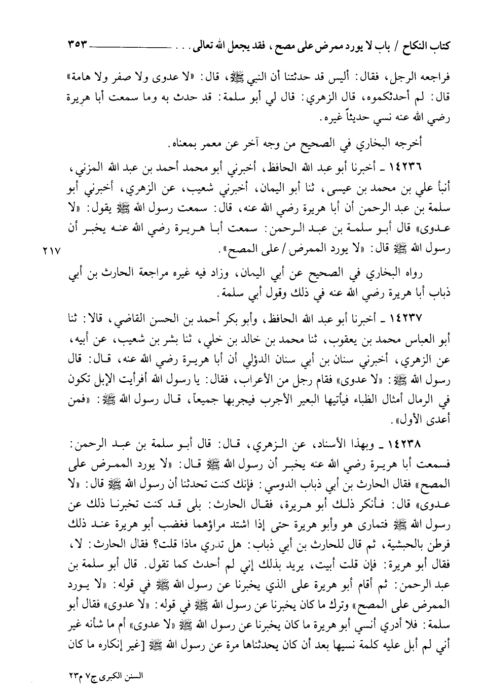 14238 - وَبِهَذَا الْإِسْنَادِ عَنِ الزُّهْرِيِّ قَالَ: قَالَ أَبُو سَلَمَةَ بْنُ عَبْدِ الرَّحْمَنِ: فَسَمِعْتُ أَبَا هُرَيْرَةَ رَضِيَ اللهُ عَنْهُ يُخْبِرُ أَنَّ رَسُولَ اللهِ صَلَّى اللهُ عَلَيْهِ وَسَلَّمَ قَالَ: §" لَا يُورِدُ الْمُمْرِضُ عَلَى الْمُصِحِّ " فَقَالَ الْحَارِثُ بْنُ أَبِي ذُبَابٍ الدَّوْسِيُّ: فَإِنَّكَ كُنْتَ تُحَدِّثُنَا أَنَّ رَسُولَ اللهِ صَلَّى اللهُ عَلَيْهِ وَسَلَّمَ قَالَ: " لَا عَدْوَى " قَالَ: فَأَنْكَرَ ذَلِكَ أَبُو هُرَيْرَةَ , فَقَالَ الْحَارِثُ: بَلَى قَدْ كُنْتَ تُخْبِرُنَا ذَلِكَ عَنْ رَسُولِ اللهِ صَلَّى اللهُ عَلَيْهِ وَسَلَّمَ , فَتَمَارَى هُوَ وَأَبُو هُرَيْرَةَ حَتَّى إِذَا اشْتَدَّ مِرَاؤُهُمَا فَغَضِبَ أَبُو هُرَيْرَةَ عِنْدَ ذَلِكَ فَرَطَنَ بِالْحَبَشِيَّةِ , ثُمَّ قَالَ لِلْحَارِثِ بْنِ أَبِي ذُبَابٍ: هَلْ تَدْرِي مَاذَا قُلْتُ؟ فَقَالَ الْحَارِثُ: لَا , فَقَالَ أَبُو هُرَيْرَةَ: فَإِنْ قُلْتُ أَبَيْتُ , يُرِيدُ بِذَلِكَ أَنِّي لَمْ أُحَدِّثْ كَمَا تَقُولُ , قَالَ أَبُو سَلَمَةَ بْنُ عَبْدِ الرَّحْمَنِ: ثُمَّ أَقَامَ أَبُو هُرَيْرَةَ عَلَى الَّذِي يُخْبِرُنَا عَنْ رَسُولِ اللهِ صَلَّى اللهُ عَلَيْهِ وَسَلَّمَ فِي قَوْلِهِ: " لَا يُورِدُ الْمُمْرِضُ عَلَى الْمُصِحِّ " وَتَرَكَ مَا كَانَ يُخْبِرُنَا عَنْ رَسُولِ اللهِ صَلَّى اللهُ عَلَيْهِ وَسَلَّمَ فِي قَوْلِهِ: " لَا عَدْوَى " , فَقَالَ أَبُو سَلَمَةَ: فَلَا أَدْرِي أَنَسِيَ أَبُو هُرَيْرَةَ مَا كَانَ يُخْبِرُنَا عَنْ رَسُولِ اللهِ صَلَّى اللهُ عَلَيْهِ وَسَلَّمَ " لَا عَدْوَى " أَمْ مَا شَأْنُهُ غَيْرَ أَنِّي لَمْ أُبْلِ عَلَيْهِ كَلِمَةً نَسِيَهَا بَعْدَ أَنْ كَانَ يُحَدِّثُنَاهَا مَرَّةً عَنْ رَسُولِ اللهِ صَلَّى اللهُ عَلَيْهِ وَسَلَّمَ غَيْرَ إِنْكَارِهِ مَا كَانَ -[354]- يُحَدِّثُنَا عَنْ رَسُولِ اللهِ صَلَّى اللهُ عَلَيْهِ وَسَلَّمَ فِي قَوْلِهِ: " لَا عَدْوَى " , رَوَاهُ مُسْلِمٌ فِي الصَّحِيحِ، عَنْ عَبْدِ اللهِ بْنِ عَبْدِ الرَّحْمَنِ الدَّارِمِيِّ عَنْ أَبِي الْيَمَانِ عَنْ شُعَيْبٍ , وَأَخْرَجَهُ الْبُخَارِيُّ، عَنْ أَبِي الْيَمَانِ مُخْتَصَرًا