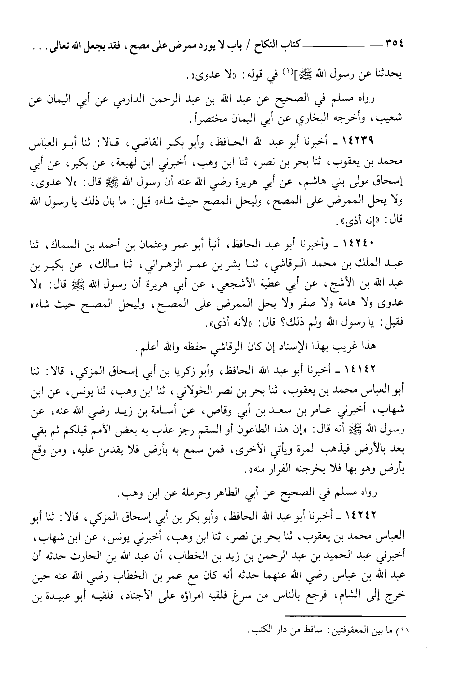 14241 - أَخْبَرَنَا أَبُو عَبْدِ اللهِ الْحَافِظُ، وَأَبُو زَكَرِيَّا بْنُ أَبِي إِسْحَاقَ الْمُزَكِّي قَالَا: ثنا أَبُو الْعَبَّاسِ مُحَمَّدُ بْنُ يَعْقُوبَ، ثنا بَحْرُ بْنُ نَصْرٍ الْخَوْلَانِيُّ، ثنا ابْنُ وَهْبٍ، ثنا يُونُسُ، عَنِ ابْنِ شِهَابٍ، أَخْبَرَنِي عَامِرُ بْنُ سَعْدِ بْنِ أَبِي وَقَّاصٍ، عَنْ أُسَامَةَ بْنِ زَيْدٍ رَضِيَ اللهُ عَنْهُ، عَنْ رَسُولِ اللهِ صَلَّى اللهُ عَلَيْهِ وَسَلَّمَ أَنَّهُ قَالَ: " إِنَّ §هَذَا الطَّاعُونَ أَوِ السَّقَمَ رِجْزٌ عُذِّبَ بِهِ بَعْضُ الْأُمَمِ قَبْلَكُمْ , ثُمَّ بَقِيَ بَعْدُ بِالْأَرْضِ فَيَذْهَبُ الْمَرَّةَ وَيَأْتِي الْأُخْرَى، فَمَنْ سَمِعَ بِهِ بِأَرْضٍ فَلَا يَقْدَمَنَّ عَلَيْهِ , وَمَنْ وَقَعَ بِأَرْضٍ وَهُوَ بِهَا فَلَا يُخْرِجَنَّهُ الْفِرَارُ مِنْهُ " , رَوَاهُ مُسْلِمٌ فِي الصَّحِيحِ، عَنْ أَبِي الطَّاهِرِ , وَحَرْمَلَةَ عَنِ ابْنِ وَهْبٍ