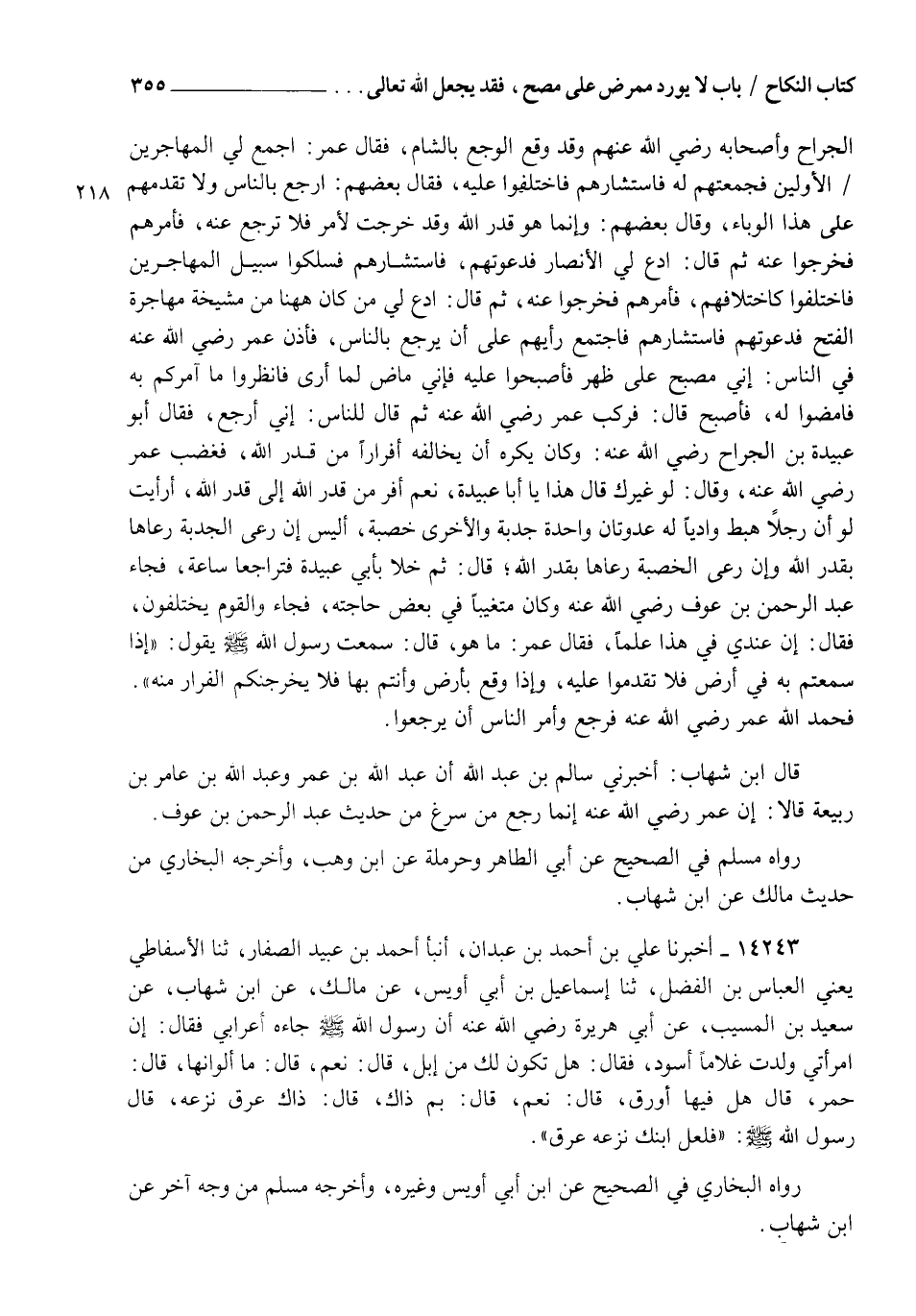 14243 - أَخْبَرَنَا عَلِيُّ بْنُ أَحْمَدَ بْنِ عَبْدَانَ، أنبأ أَحْمَدُ بْنُ عُبَيْدٍ الصَّفَّارُ، ثنا الْأَسْفَاطِيُّ يَعْنِي الْعَبَّاسَ بْنَ الْفَضْلِ، ثنا إِسْمَاعِيلُ بْنُ أَبِي أُوَيْسٍ، عَنْ مَالِكٍ، عَنِ ابْنِ شِهَابٍ، عَنْ سَعِيدِ بْنِ الْمُسَيِّبِ، عَنْ أَبِي هُرَيْرَةَ رَضِيَ اللهُ عَنْهُ أَنَّ رَسُولَ اللهِ صَلَّى اللهُ عَلَيْهِ وَسَلَّمَ جَاءَهُ أَعْرَابِيٌّ فَقَالَ: إِنَّ امْرَأَتِي وَلَدَتْ غُلَامًا أَسْوَدَ , فَقَالَ: " هَلْ تَكُونُ لَكَ مِنْ إِبِلٍ؟ " قَالَ: نَعَمْ قَالَ: " مَا أَلْوَانُهَا؟ " قَالَ: حُمْرٌ قَالَ: " هَلْ فِيهَا أَوْرَقُ؟ " قَالَ: نَعَمْ , قَالَ: " بِمَ ذَاكَ؟ " قَالَ: ذَاكَ عِرْقٌ نَزَعَهُ , قَالَ رَسُولُ اللهِ صَلَّى اللهُ عَلَيْهِ وَسَلَّمَ: §" فَلَعَلَّ ابْنَكَ نَزَعَهُ عِرْقٌ " , رَوَاهُ الْبُخَارِيُّ فِي الصَّحِيحِ عَنِ ابْنِ أَبِي أُوَيْسٍ وَغَيْرِهِ , وَأَخْرَجَهُ مُسْلِمٌ مِنْ وَجْهٍ آخَرَ عَنِ ابْنِ شِهَابٍ