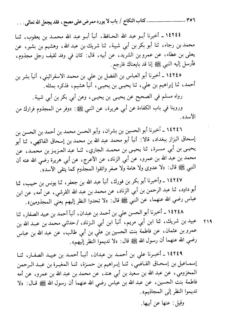 14245 - أَخْبَرَنَا أَبُو الْعَبَّاسِ بْنُ الْفَضْلِ بْنِ عَلِيِّ بْنِ مُحَمَّدٍ الْإِسْفِرَايِينِيُّ، أنبأ بِشْرُ بْنُ أَحْمَدَ، ثنا إِبْرَاهِيمُ بْنُ عَلِيٍّ، ثنا يَحْيَى بْنُ يَحْيَى، أنبأ هُشَيْمٌ، فَذَكَرَهُ بِمِثْلِهِ. رَوَاهُ مُسْلِمٌ فِي الصَّحِيحِ، عَنْ يَحْيَى بْنِ يَحْيَى وَعَنْ أَبِي بَكْرِ بْنِ أَبِي شَيْبَةَ , وَرَوَيْنَا فِي بَابِ الْكَفَاءَةِ عَنْ أَبِي هُرَيْرَةَ عَنِ النَّبِيِّ صَلَّى اللهُ عَلَيْهِ وَسَلَّمَ: " وَفِرَّ مِنَ الْمَجْذُومِ فِرَارَكَ مِنَ الْأَسَدِ "