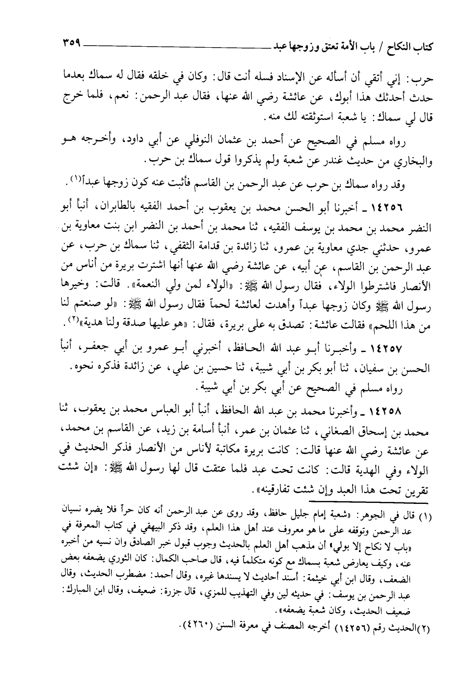 14258 - وَأَخْبَرَنَا مُحَمَّدُ بْنُ عَبْدِ اللهِ الْحَافِظُ، أنبأ أَبُو الْعَبَّاسِ مُحَمَّدُ بْنُ يَعْقُوبَ، ثنا مُحَمَّدُ بْنُ إِسْحَاقَ الصَّغَانِيُّ، ثنا عُثْمَانُ بْنُ عُمَرَ، أنبأ أُسَامَةُ بْنُ زَيْدٍ، عَنِ الْقَاسِمِ بْنِ مُحَمَّدٍ، عَنْ عَائِشَةَ رَضِيَ اللهُ عَنْهَا قَالَتْ: كَانَتْ بَرِيرَةُ مُكَاتِبَةً لِأُنَاسٍ مِنَ الْأَنْصَارِ فَذَكَرَ الْحَدِيثَ فِي الْوَلَاءِ وَفِي الْهَدِيَّةِ , قَالَتْ: كَانَتْ تَحْتَ عَبْدٍ، فَلَمَّا عَتَقَتْ قَالَ لَهَا رَسُولُ اللهِ صَلَّى اللهُ عَلَيْهِ وَسَلَّمَ: §" إِنْ شِئْتِ تَقَرَّينَ تَحْتَ هَذَا الْعَبْدِ وَإِنْ شِئْتِ تُفَارِقِينَهُ " , -[360]- هَذَا يُؤَكِّدُ رِوَايَةَ سِمَاكِ بْنِ حَرْبٍ , وَقَدْ قِيلَ عَنْ أُسَامَةَ، عَنِ الزُّهْرِيِّ، عَنِ الْقَاسِمِ بْنِ مُحَمَّدٍ، عَنْ عَائِشَةَ مُخْتَصَرًا , وَكَذَلِكَ رَوَاهُ عُرْوَةُ بْنُ الزُّبَيْرِ، عَنْ عَائِشَةَ رَضِيَ اللهُ عَنْهَا