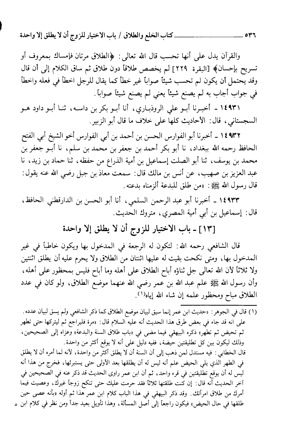 14932 - أَخْبَرَنَا أَبُو الْفَوَارِسِ الْحَسَنُ بْنُ أَحْمَدَ بْنِ أَبِي الْفَوَارِسِ أَخُو الشَّيْخِ أَبِي الْفَتْحِ الْحَافِظِ رَحِمَهُ اللهُ بِبَغْدَادَ نا أَبُو بَكْرٍ أَحْمَدُ بْنُ جَعْفَرِ بْنِ مُحَمَّدِ بْنِ سَلَمٍ نا أَبُو جَعْفَرِ مُحَمَّدِ بْنِ يُوسُفَ، ثنا أَبُو الصَّلْتِ إِسْمَاعِيلُ بْنُ أبي أُمَيَّةَ الذَّرَّاعُ مِنْ حِفْظِهِ ثنا حَمَّادُ بْنُ زَيْدٍ، نا عَبْدُ الْعَزِيزِ بْنُ صُهَيْبٍ، عَنْ أَنَسِ بْنِ مَالِكٍ قَالَ: سَمِعْتُ مُعَاذَ بْنَ جَبَلٍ رَضِيَ اللهُ عَنْهُ يَقُولُ: قَالَ رَسُولُ اللهِ صَلَّى اللهُ عَلَيْهِ وَسَلَّمَ: §" مَنْ طَلَّقَ لِلْبِدْعَةِ أَلْزَمْنَاهُ بِدْعَتَهُ "