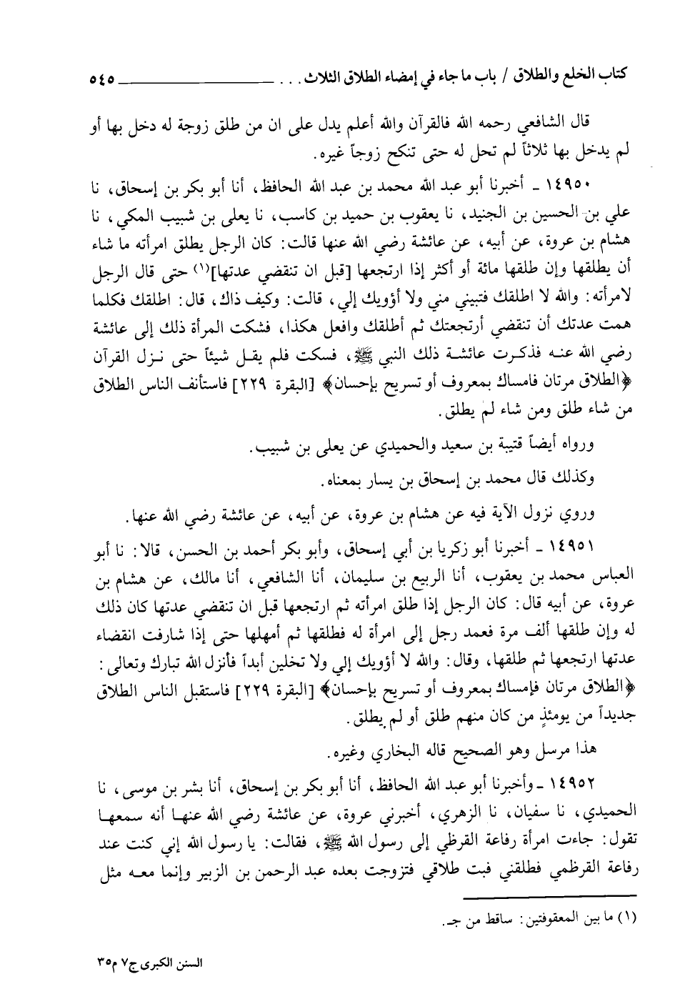 14951 - أَخْبَرَنَا أَبُو زَكَرِيَّا بْنُ أَبِي إِسْحَاقَ، وَأَبُو بَكْرٍ أَحْمَدُ بْنُ الْحَسَنِ قَالَا: نا أَبُو الْعَبَّاسِ مُحَمَّدُ بْنُ يَعْقُوبَ أنا الرَّبِيعُ بْنُ سُلَيْمَانَ، أنا الشَّافِعِيُّ، أنا مَالِكٌ، عَنْ هِشَامِ بْنِ عُرْوَةَ، عَنْ أَبِيهِ قَالَ: كَانَ الرَّجُلُ إِذَا طَلَّقَ امْرَأَتَهُ ثُمَّ ارْتَجَعَهَا قَبْلَ أَنْ تَنْقَضِيَ عِدَّتُهَا كَانَ ذَلِكَ لَهُ وَإِنْ طَلَّقَهَا أَلْفَ مَرَّةٍ فَعَمَدَ رَجُلٌ إِلَى امْرَأَةٍ لَهُ فَطَلَّقَهَا ثُمَّ أَمْهَلَهَا حَتَّى إِذَا شَارَفَتِ انْقِضَاءَ عِدَّتِهَا ارْتَجَعَهَا ثُمَّ طَلَّقَهَا وَقَالَ: وَاللهِ لَا أُؤْوِيكِ إِلِيَّ وَلَا تَخْلِينَ أَبَدًا , فَأَنْزَلَ اللهُ تَبَارَكَ وَتَعَالَى {§الطَّلَاقُ مَرَّتَانِ فَإِمْسَاكٌ بِمَعْرُوفٍ أَوْ تَسْرِيحٌ بِإِحْسَانٍ} [البقرة: 229] فَاسْتَقْبَلَ النَّاسُ الطَّلَاقَ جَدِيدًا مِنْ يَوْمِئِذٍ مَنْ كَانَ مِنْهُمْ طَلَّقَ أَوْ لَمْ يُطَلِّقْ " هَذَا مُرْسَلٌ وَهُوَ الصَّحِيحُ قَالَهُ الْبُخَارِيُّ وَغَيْرُهُ