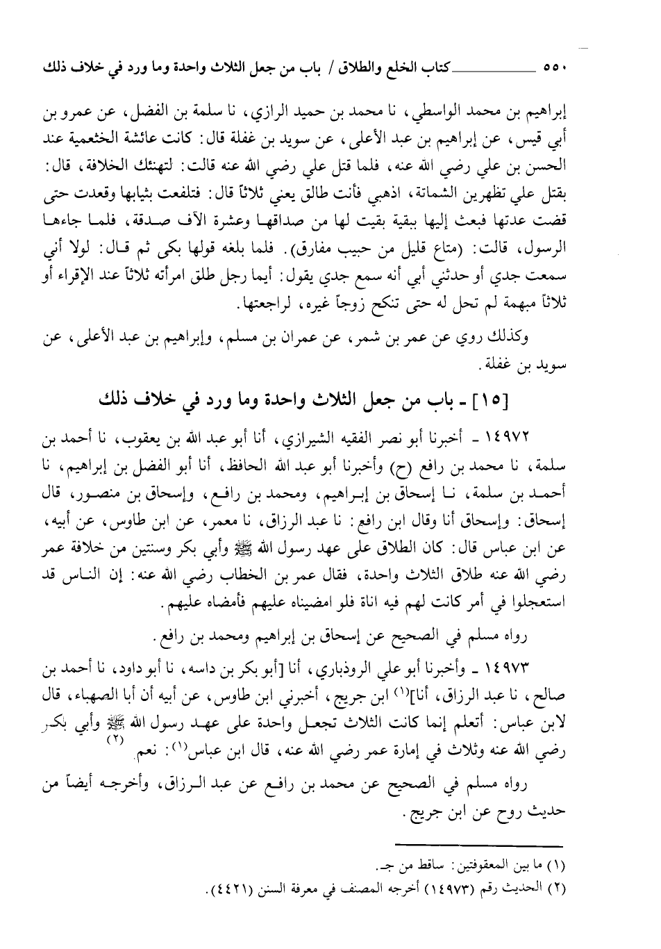 14972 - أَخْبَرَنَا أَبُو نَصْرٍ الْفَقِيهُ الشِّيرَازِيُّ، أنا أَبُو عَبْدِ اللهِ بْنُ يَعْقُوبَ، نا أَحْمَدُ بْنُ سَلَمَةَ، نا مُحَمَّدُ بْنُ رَافِعٍ، ح وَأَخْبَرَنَا أَبُو عَبْدِ اللهِ الْحَافِظُ، أنا أَبُو الْفَضْلِ بْنُ إِبْرَاهِيمَ، نا أَحْمَدُ بْنُ سَلَمَةَ، نا إِسْحَاقُ بْنُ إِبْرَاهِيمَ، وَمُحَمَّدُ بْنُ رَافِعٍ، وَإِسْحَاقُ بْنُ مَنْصُورٍ، قَالَ إِسْحَاقُ: وَإِسْحَاقُ أنا وَقَالَ ابْنُ رَافِعٍ: نا عَبْدُ الرَّزَّاقِ، نا مَعْمَرٌ، عَنِ ابْنِ طَاوُسٍ، عَنْ أَبِيهِ، عَنِ ابْنِ عَبَّاسٍ قَالَ: " كَانَ §الطَّلَاقُ عَلَى عَهْدِ رَسُولِ اللهِ صَلَّى اللهُ عَلَيْهِ وَسَلَّمَ وَأَبِي بَكْرٍ وَسَنَتَيْنِ مِنْ خِلَافَةِ عُمَرَ رَضِيَ اللهُ عَنْهُ طَلَاقُ الثَّلَاثِ وَاحِدَةٌ , فَقَالَ عُمَرُ بْنُ الْخَطَّابِ رَضِيَ اللهُ عَنْهُ: إِنَّ النَّاسَ قَدِ اسْتَعْجَلُوا فِي أَمْرٍ كَانَتْ لَهُمْ فِيهِ أَنَاةٌ، فَلَوْ أَمْضَيْنَاهُ عَلَيْهِمْ " فَأَمْضَاهُ عَلَيْهِمْ. رَوَاهُ مُسْلِمٌ فِي الصَّحِيحِ عَنْ إِسْحَاقَ بْنِ إِبْرَاهِيمَ وَمُحَمَّدِ بْنِ رَافِعٍ