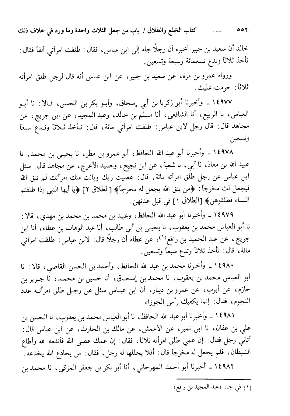 14979 - وَأَخْبَرَنَا أَبُو عَبْدِ اللهِ الْحَافِظُ، وَعُبَيْدُ بْنُ مُحَمَّدِ بْنِ مُحَمَّدِ بْنِ مَهْدِيٍّ قَالَا: نا أَبُو الْعَبَّاسِ مُحَمَّدُ بْنُ يَعْقُوبَ نا يَحْيَى بْنُ أَبِي طَالِبٍ، أنا عَبْدُ الْوَهَّابِ بْنُ عَطَاءٍ، أنا ابْنُ جُرَيْجٍ، عَنْ عَبْدِ الْحَمِيدِ بْنِ رَافِعٍ، عَنْ عَطَاءٍ، أَنَّ رَجُلًا قَالَ لِابْنِ عَبَّاسٍ: §طَلَّقْتُ امْرَأَتِي مِائَةً قَالَ: " تَأْخُذُ ثَلَاثًا وَتَدَعُ سَبْعًا وَتِسْعِينَ "