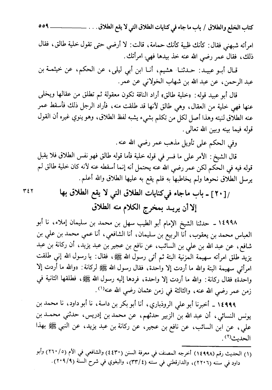14998 - حَدَّثَنَا الشَّيْخُ الْإِمَامُ أَبُو الطَّيِّبِ سَهْلُ بْنُ مُحَمَّدِ بْنِ سُلَيْمَانَ إِمْلَاءً نا أَبُو الْعَبَّاسِ مُحَمَّدُ بْنُ يَعْقُوبَ أنا الرَّبِيعُ بْنُ سُلَيْمَانَ، أنا الشَّافِعِيُّ، أنا عَمِّي مُحَمَّدُ بْنُ عَلِيِّ بْنِ شَافِعٍ عَنْ عَبْدِ اللهِ بْنِ عَلِيِّ بْنِ السَّائِبِ، عَنْ نَافِعِ بْنِ عُجَيْرِ بْنِ عَبْدِ يَزِيدَ، أَنَّ رُكَانَةَ بْنَ عَبْدِ يَزِيدَ، طَلَّقَ امْرَأَتَهُ سُهَيْمَةَ الْمُزَنِيَّةَ الْبَتَّةَ ثُمَّ أَتَى رَسُولَ اللهِ صَلَّى اللهُ عَلَيْهِ وَسَلَّمَ، فَقَالَ: يَا رَسُولَ اللهِ إِنِّي طَلَّقْتُ امْرَأَتِي سُهَيْمَةَ الْبَتَّةَ وَاللهِ مَا أَرَدْتُ إِلَّا وَاحِدَةً , فَقَالَ رَسُولُ اللهِ صلَّى الله عَلَيْهِ وَسَلَّمَ لِرُكَانَةَ: " §وَاللهِ مَا أَرَدْتَ إِلَّا وَاحِدَةً؟ " فَقَالَ رُكَانَةُ: وَاللهِ مَا أَرَدْتُ إِلَّا وَاحِدَةً , فَرَدَّهَا إِلَيْهِ رَسُولُ اللهِ صَلَّى اللهُ عَلَيْهِ وَسَلَّمَ فَطَلَّقَهَا الثَّانِيَةَ فِي زَمَنِ عُمَرَ رَضِيَ اللهُ عَنْهُ وَالثَّالِثَةَ فِي زَمَنِ عُثْمَانَ رَضِيَ اللهُ عَنْهُ