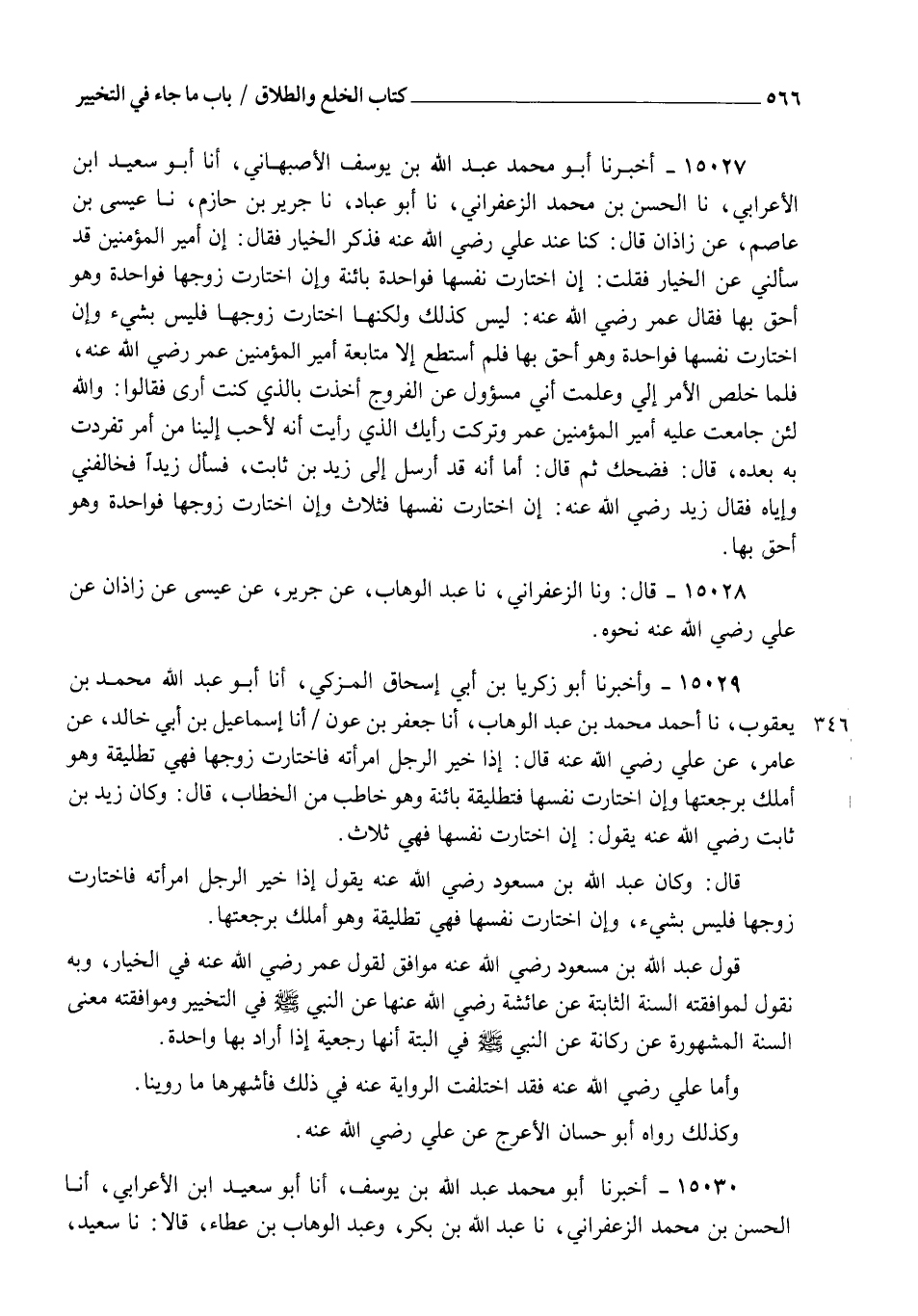15027 - أَخْبَرَنَا أَبُو مُحَمَّدٍ عَبْدُ اللهِ بْنُ يُوسُفَ الْأَصْبَهَانِيُّ، أنا أَبُو سَعِيدِ بْنُ الْأَعْرَابِيِّ، نا الْحَسَنُ بْنُ مُحَمَّدٍ الزَّعْفَرَانِيُّ، نا أَبُو عَبَّادٍ، نا جَرِيرُ بْنُ حَازِمٍ، نا عِيسَى بْنُ عَاصِمٍ، عَنْ زَاذَانَ قَالَ: كُنَّا عِنْدَ عَلِيٍّ رَضِيَ اللهُ عَنْهُ فَذَكَرَ الْخِيَارَ فَقَالَ: إِنَّ أَمِيرَ الْمُؤْمِنِينَ قَدْ سَأَلَنِي عَنِ الْخِيَارِ فَقُلْتُ: §" إِنِ اخْتَارَتْ نَفْسَهَا فَوَاحِدَةٌ بَائِنَةٌ وَإِنِ اخْتَارَتْ زَوْجَهَا فَوَاحِدَةٌ وَهُوَ أَحَقُّ بِهَا " فَقَالَ عُمَرُ رَضِيَ اللهُ عَنْهُ: " لَيْسَ كَذَلِكَ وَلَكِنَّهَا اخْتَارَتْ زَوْجَهَا فَلَيْسَ بِشَيْءٍ , وَإِنِ اخْتَارَتْ نَفْسَهَا فَوَاحِدَةٌ وَهُوَ أَحَقُّ بِهَا فَلَمْ أَسْتَطِعْ إِلَّا مُتَابَعَةَ أَمِيرِ الْمُؤْمِنِينَ عُمَرَ رَضِيَ اللهُ عَنْهُ "، فَلَمَّا خَلَصَ الْأَمْرُ إِلِيَّ وَعَلِمْتُ أَنِّي مَسْئُولٌ عَنِ الْفُرُوجِ أَخَذْتُ بِالَّذِي كُنْتُ أَرَى فَقَالُوا: وَاللهِ لَئِنْ جَامَعْتَ عَلَيْهِ أَمِيرَ الْمُؤْمِنِينَ عُمَرَ وَتَرَكْتَ رَأْيَكَ الَّذِي رَأَيْتَ إِنَّهُ لَأَحَبُّ إِلَيْنَا مِنْ أَمْرٍ تَفَرَّدْتَ بِهِ بَعْدَهُ , قَالَ: فَضَحِكَ، ثُمَّ قَالَ: أَمَا إِنَّهُ قَدْ أَرْسَلَ إِلَى زَيْدِ بْنِ ثَابِتٍ فَسَأَلَ زَيْدًا فَخَالَفَنِي وَإِيَّاهُ , فَقَالَ زَيْدٌ رَضِيَ اللهُ عَنْهُ: " إِنِ اخْتَارَتْ نَفْسَهَا فَثَلَاثٌ، وَإِنِ اخْتَارَتْ زَوْجَهَا فَوَاحِدَةٌ وَهُوَ أَحَقُّ بِهَا "