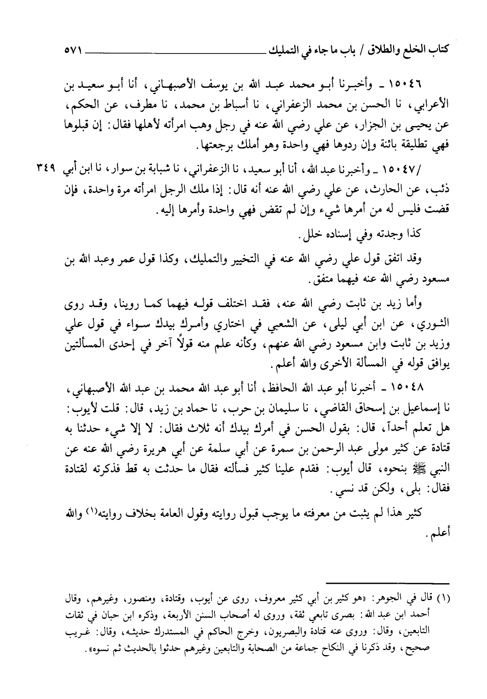 15048 - أَخْبَرَنَا أَبُو عَبْدِ اللهِ الْحَافِظُ، أنا أَبُو عَبْدِ اللهِ مُحَمَّدُ بْنُ عَبْدِ اللهِ الْأَصْبَهَانِيُّ نا إِسْمَاعِيلُ بْنُ إِسْحَاقَ الْقَاضِي، نا سُلَيْمَانُ بْنُ حَرْبٍ، نا حَمَّادُ بْنُ زَيْدٍ قَالَ: قُلْتُ لِأَيُّوبَ: هَلْ تَعْلَمُ أَحَدًا قَالَ بِقَوْلِ الْحَسَنِ فِي: " §أَمْرُكِ بِيَدِكِ " أَنَّهُ ثَلَاثٌ؟ فَقَالَ: لَا إِلَّا شَيْءٌ حَدَّثَنَا بِهِ قَتَادَةُ عَنْ كَثِيرٍ مَوْلَى عَبْدِ الرَّحْمَنِ بْنِ سَمُرَةَ عَنْ أَبِي سَلَمَةَ عَنْ أَبِي هُرَيْرَةَ رَضِيَ اللهُ عَنْهُ عَنِ النَّبِيِّ صَلَّى اللهُ عَلَيْهِ وَسَلَّمَ بِنَحْوِهِ " قَالَ أَيُّوبُ: فَقَدِمَ عَلَيْنَا كَثِيرٌ فَسَأَلْتُهُ , فَقَالَ: مَا حَدَّثْتُ بِهِ قَطُّ فَذَكَرْتُهُ لِقَتَادَةَ فَقَالَ: بَلَى وَلَكِنْ قَدْ نُسِيَ كَثِيرٌ هَذَا لَمْ يَثْبُتْ مِنْ مَعْرِفَتِهِ مَا يُوجِبُ قَبُولَ رِوَايَتِهِ , وَقَوْلُ الْعَامَّةِ بِخِلَافِ رِوَايَتِهِ وَاللهُ أَعْلَمُ