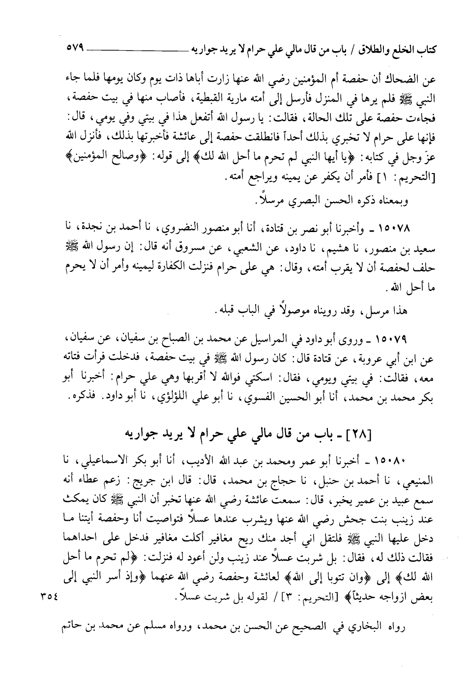 15078 - وَأَخْبَرَنَا أَبُو نَصْرِ بْنُ قَتَادَةَ، أنا أَبُو مَنْصُورٍ النَّضْرَوِيُّ، نا أَحْمَدُ بْنُ نَجْدَةَ، نا سَعِيدُ بْنُ مَنْصُورٍ، نا هُشَيْمٌ، نا دَاوُدُ، عَنِ الشَّعْبِيِّ، عَنْ مَسْرُوقٍ، أَنَّهُ قَالَ: " إِنَّ رَسُولَ اللهِ صَلَّى اللهُ عَلَيْهِ وَسَلَّمَ حَلَفَ لِحَفْصَةَ أَنْ لَا يَقْرَبَ أَمَتَهُ وَقَالَ: §" هِيَ عَلَيَّ حَرَامٌ " , فَنَزَلَتِ الْكَفَّارَةُ لِيَمِينِهِ وَأُمِرَ أَنْ لَا يُحَرِّمَ مَا أَحَلَّ اللهُ " هَذَا مُرْسَلٌ وَقَدْ رَوَيْنَاهُ مَوْصُولًا فِي الْبَابِ قَبْلَهُ