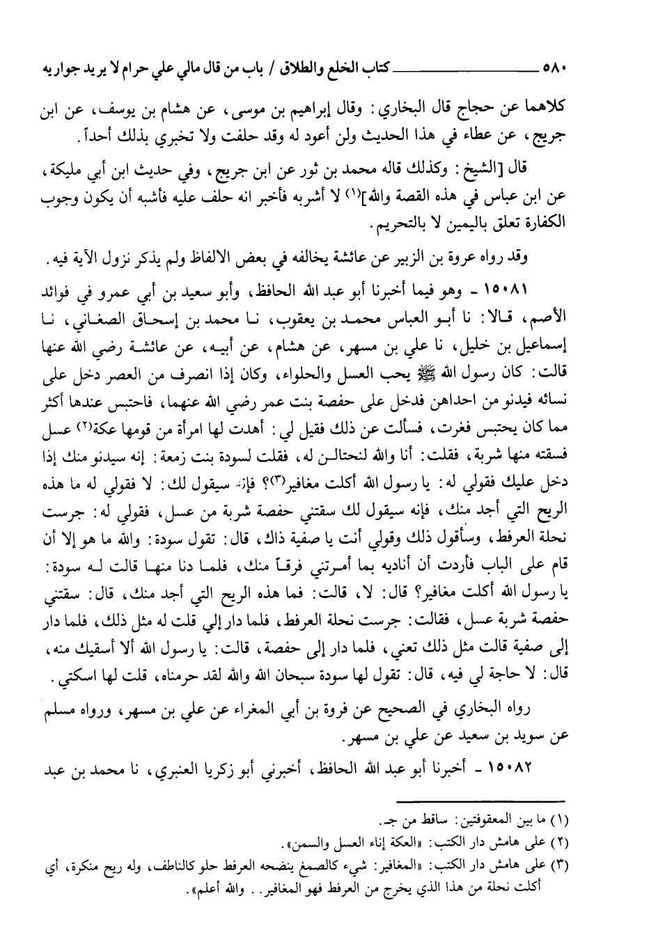 15081 - وَهُوَ فِيمَا أَخْبَرَنَا أَبُو عَبْدِ اللهِ الْحَافِظُ، وَأَبُو سَعِيدِ بْنُ أَبِي عَمْرٍو فِي فَوَائِدِ الْأَصَمِّ قَالَا: نا أَبُو الْعَبَّاسِ مُحَمَّدُ بْنُ يَعْقُوبَ نا مُحَمَّدُ بْنُ إِسْحَاقَ الصَّغَانِيُّ، نا إِسْمَاعِيلُ بْنُ خَلِيلٍ، نا عَلِيُّ بْنُ مُسْهِرٍ، عَنْ هِشَامٍ، عَنْ أَبِيهِ، عَنْ عَائِشَةَ رَضِيَ اللهُ عَنْهَا قَالَتْ: كَانَ رَسُولُ اللهِ صَلَّى اللهُ عَلَيْهِ وَسَلَّمَ يُحِبُّ الْعَسَلَ وَالْحَلْوَاءَ، وَكَانَ إِذَا انْصَرَفَ مِنَ الْعَصْرِ دَخَلَ عَلَى نِسَائِهِ فَيَدْنُو مِنْ إِحْدَاهُنَّ، فَدَخَلَ عَلَى حَفْصَةَ بِنْتِ عُمَرَ رَضِيَ اللهُ عَنْهُمَا فَاحْتَبَسَ عِنْدَهَا أَكْثَرَ مِمَّا كَانَ يَحْتَبِسُ فَغِرْتُ فَسَأَلْتُ عَنْ ذَلِكَ فَقِيلَ لِي: أَهْدَتْ لَهَا امْرَأَةً مِنْ قَوْمِهَا عُكَّةَ عَسَلٍ فَسَقَتْهُ مِنْهَا شَرْبَةً فَقُلْتُ: إِنَّا وَاللهِ لَنَحْتَالَنَّ لَهُ، فَقُلْتُ لِسَوْدَةَ بِنْتِ زَمْعَةَ: إِنَّهُ سَيَدْنُو مِنْكِ إِذَا دَخَلَ عَلَيْكِ فَقُولِي لَهُ: يَا رَسُولَ اللهِ أَكَلْتَ مَغَافِيرَ، فَإِنَّهُ سَيَقُولُ لَكِ: لَا، فَقُولِي لَهُ: مَا هَذِهِ الرِّيحُ الَّتِي أَجِدُ مِنْكَ؟ فَإِنَّهُ سَيَقُولُ لَكِ: سَقَتْنِي حَفْصَةُ شَرْبَةً مِنْ عَسَلٍ , فَقُولِي لَهُ: جَرَسَتْ نَحْلُهُ الْعُرْفُطَ , وَسَأَقُولُ ذَلِكَ، وَقُولِي أَنْتِ يَا صَفِيَّةُ ذَاكَ، قَالَ: تَقُولُ سَوْدَةُ: وَاللهِ مَا هُوَ إِلَّا أَنْ قَامَ عَلَى الْبَابِ فَأَرَدْتُ أَنْ أُنَادِيَهُ بِمَا أَمَرْتِنِي فَرَقًا مِنْكِ، فَلَمَّا دَنَا مِنْهَا قَالَتْ لَهُ سَوْدَةُ: يَا رَسُولَ اللهِ أَكَلْتَ مَغَافِيرَ؟ قَالَ: " لَا " قَالَتْ: فَمَا هَذِهِ الرِّيحُ الَّتِي أَجِدُ مِنْكَ؟ قَالَ: " §سَقَتْنِي حَفْصَةُ شَرْبَةَ عَسَلٍ " فَقَالَتْ: جَرَسَتْ نَحْلُهُ الْعُرْفُطَ، فَلَمَّا دَارَ إِلِيَّ قُلْتُ لَهُ مِثْلَ ذَلِكَ، فَلَمَّا دَارَ إِلَى صَفِيَّةَ قَالَتْ مِثْلَ ذَلِكَ، تَعْنِي فَلَمَّا دَارَ إِلَى حَفْصَةَ قَالَتْ: يَا رَسُولَ اللهِ أَلَا أَسْقِيكَ مِنْهُ؟ قَالَ: " لَا حَاجَةَ لِي فِيهِ " قَالَ: تَقُولُ لَهَا سَوْدَةُ: سُبْحَانَ اللهِ، وَاللهِ لَقَدْ حَرَّمْنَاهُ , قُلْتُ لَهَا: اسْكُتِي " رَوَاهُ الْبُخَارِيُّ فِي الصَّحِيحِ عَنْ فَرْوَةَ بْنِ أَبِي الْمَغْرَاءِ عَنْ عَلِيِّ بْنِ مُسْهِرٍ , وَرَوَاهُ مُسْلِمٌ عَنْ سُوَيْدِ بْنِ سَعِيدٍ عَنْ عَلِيِّ بْنِ مُسْهِرٍ