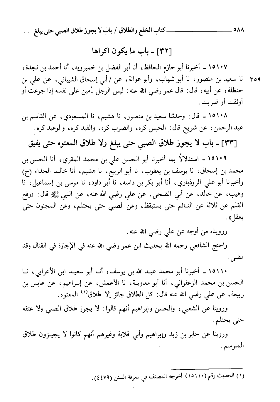15110 - أَخْبَرَنَا أَبُو مُحَمَّدٍ عَبْدُ اللهِ بْنُ يُوسُفَ، أنا أَبُو سَعِيدِ بْنُ الْأَعْرَابِيِّ، نا الْحَسَنُ بْنُ مُحَمَّدٍ الزَّعْفَرَانِيُّ، أنا أَبُو مُعَاوِيَةَ، نا الْأَعْمَشُ، عَنْ إِبْرَاهِيمَ، عَنْ عَابِسِ بْنِ رَبِيعَةَ، عَنْ عَلِيٍّ رَضِيَ اللهُ عَنْهُ قَالَ: §" كُلُّ الطَّلَاقِ جَائِزٌ إِلَّا طَلَاقَ الْمَعْتُوهِ " وَرُوِّينَا عَنِ الشَّعْبِيِّ وَالْحَسَنِ وَإِبْرَاهِيمَ أَنَّهُمْ قَالُوا: " لَا يَجُوزُ طَلَاقُ الصَّبِيِّ وَلَا عِتْقُهُ حَتَّى يَحْتَلِمَ " , وَرُوِّينَا عَنْ جَابِرِ بْنِ زَيْدٍ وَإِبْرَاهِيمَ وَأَبِي قِلَابَةَ وَغَيْرِهِمْ أَنَّهُمْ كَانُوا لَا يُجِيزُونَ طَلَاقَ الْمُبَرْسَمِ , -[589]- وَعَنِ الشَّعْبِيِّ وَإِبْرَاهِيمَ فِي الَّذِي يُطَلِّقُ وَيَعْتِقُ فِي الْمَنَامِ قَالَا: " لَيْسَ بِشَيْءٍ "