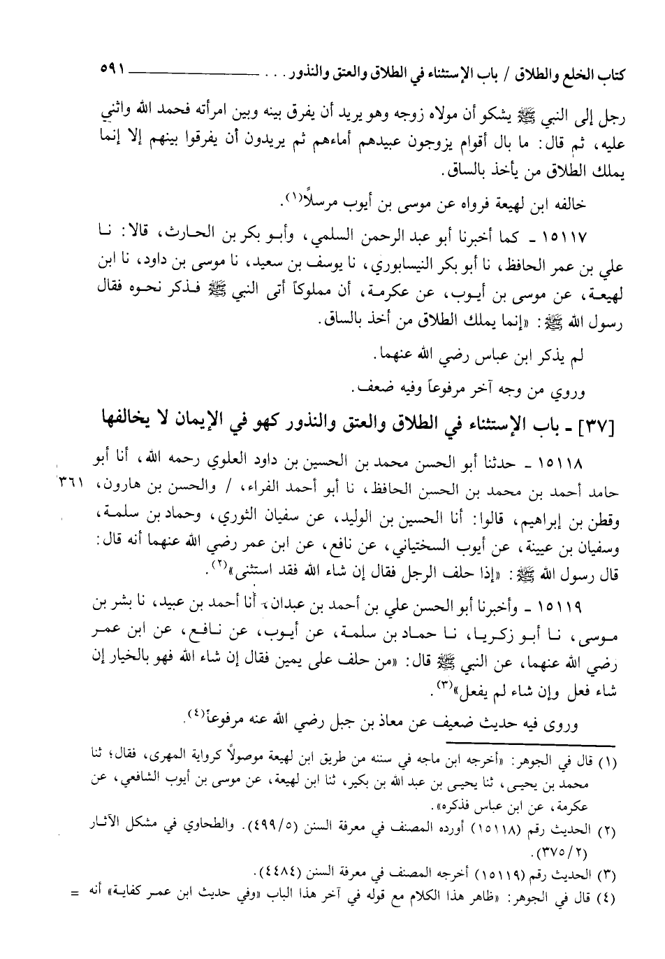 15118 - حَدَّثَنَا أَبُو الْحَسَنِ مُحَمَّدُ بْنُ الْحُسَيْنِ بْنِ دَاوُدَ الْعَلَوِيُّ رَحِمَهُ اللهُ أنا أَبُو حَامِدٍ أَحْمَدُ بْنُ مُحَمَّدِ بْنِ الْحَسَنِ الْحَافِظُ نا أَبُو أَحْمَدَ الْفَرَّاءُ، وَالْحَسَنُ بْنُ هَارُونَ، وَقَطَنُ بْنُ إِبْرَاهِيمَ، قَالُوا: أنا الْحُسَيْنُ بْنُ الْوَلِيدِ، عَنْ سُفْيَانَ الثَّوْرِيِّ، وَحَمَّادُ بْنُ سَلَمَةَ، وَسُفْيَانُ بْنُ عُيَيْنَةَ، عَنْ أَيُّوبَ السَّخْتِيَانِيِّ، عَنْ نَافِعٍ، عَنِ ابْنِ عُمَرَ رَضِيَ اللهُ عَنْهُمَا أَنَّهُ قَالَ: قَالَ رَسُولُ اللهِ صلَّى الله عَلَيْهِ وَسَلَّمَ: §" إِذَا حَلَفَ الرَّجُلُ فَقَالَ إِنْ شَاءَ اللهُ فَقَدِ اسْتَثْنَى "