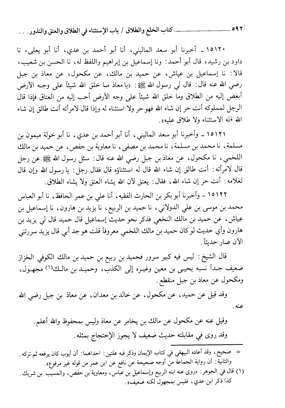 15120 - أَخْبَرَنَا أَبُو سَعْدٍ الْمَالِينِيُّ، أنا أَبُو أَحْمَدَ بْنُ عَدِيٍّ، أنا أَبُو يَعْلَى، نا دَاوُدُ بْنُ رُشَيْدٍ، قَالَ أَبُو أَحْمَدَ وَنا إِسْمَاعِيلُ بْنُ إِبْرَاهِيمَ وَاللَّفْظُ لَهُ نا الْحَسَنُ بْنُ شُعَيْبٍ قَالَ: نا إِسْمَاعِيلُ بْنُ عَيَّاشٍ، عَنْ حُمَيْدِ بْنِ مَالِكٍ، عَنْ مَكْحُولٍ، عَنْ مُعَاذِ بْنِ جَبَلٍ رَضِيَ اللهُ عَنْهُ قَالَ: قَالَ لِي رَسُولُ اللهِ صَلَّى اللهُ عَلَيْهِ وَسَلَّمَ: " يَا مُعَاذُ §مَا خَلَقَ اللهُ شَيْئًا عَلَى وَجْهِ الْأَرْضِ أَبْغَضَ إِلَيْهِ مِنَ الطَّلَاقِ، وَمَا خَلَقَ اللهُ شَيْئًا عَلَى وَجْهِ الْأَرْضِ أَحَبَّ إِلَيْهِ مِنَ الْعَتَاقِ , فَإِذَا قَالَ الرَّجُلُ لِمَمْلُوكِهِ أَنْتَ حُرٌّ إِنْ شَاءَ اللهُ فَهُوَ حُرٌّ وَلَا اسْتِثْنَاءَ لَهُ , وَإِذَا قَالَ لِامْرَأَتِهِ أَنْتِ طَالِقٌ إِنْ شَاءَ اللهُ فَلَهُ الِاسْتِثْنَاءُ وَلَا طَلَاقَ عَلَيْهِ "
