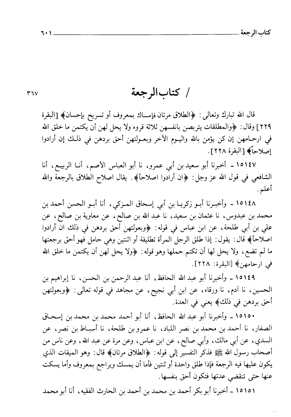 قَالَ اللهُ تَبَارَكَ وَتَعَالَى: {الطَّلَاقُ مَرَّتَانِ فَإِمْسَاكٌ بِمَعْرُوفٍ أَوْ تَسْرِيحٌ بِإِحْسَانٍ} [البقرة: 229] وَقَالَ: {وَالْمُطَلَّقَاتُ يَتَرَبَّصْنَ بِأَنْفُسِهِنَّ ثَلَاثَةَ قُرُوءٍ وَلَا يَحِلُّ لَهُنَّ أَنْ يَكْتُمْنَ مَا خَلَقَ اللهُ فِي أَرْحَامِهِنَّ إِنْ كُنَّ يُؤْمِنَّ بِاللهِ وَالْيَوْمِ الْآخِرِ وَبُعُولَتُهُنَّ أَحَقُّ بِرَدِّهِنَّ فِي ذَلِكَ إِنْ أَرَادُوا إِصْلَاحًا} [البقرة: 228]