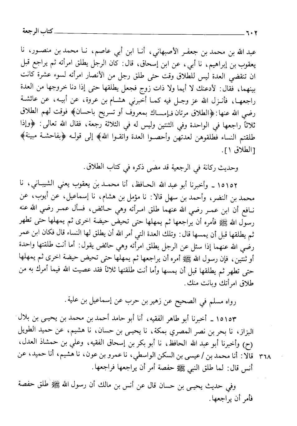 15152 - وَأَخْبَرَنَا أَبُو عَبْدِ اللهِ الْحَافِظُ، أنا مُحَمَّدُ بْنُ يَعْقُوبَ يَعْنِي الشَّيْبَانِيَّ، نا مُحَمَّدُ بْنُ النَّضْرِ، وَأَحْمَدُ بْنُ سَهْلٍ قَالَا: نا مُؤَمَّلُ بْنُ هِشَامٍ، نا إِسْمَاعِيلُ، عَنْ أَيُّوبَ، عَنْ نَافِعٍ، أَنَّ ابْنَ عُمَرَ رَضِيَ اللهُ عَنْهُمَا §طَلَّقَ امْرَأَتَهُ وَهِيَ حَائِضٌ فَسَأَلَ عُمَرُ رَضِيَ اللهُ عَنْهُ رَسُولَ اللهِ صَلَّى اللهُ عَلَيْهِ وَسَلَّمَ " فَأَمَرَهُ أَنْ يُرَاجِعَهَا ثُمَّ يُمْهِلَهَا حَتَّى تَحِيضَ حَيْضَةً أُخْرَى ثُمَّ يُمْهِلَهَا حَتَّى تَطْهُرَ ثُمَّ يُطَلِّقَهَا قَبْلَ أَنْ يَمَسَّهَا قَالَ: وَتِلْكَ الْعِدَّةُ الَّتِي أَمَرَ اللهُ أَنْ يُطَلَّقَ لَهَا النِّسَاءُ " قَالَ: فَكَانَ ابْنُ عُمَرَ رَضِيَ اللهُ عَنْهُمَا إِذَا سُئِلَ عَنِ الرَّجُلِ يُطَلِّقُ امْرَأَتَهُ وَهِيَ حَائِضٌ يَقُولُ: أَمَّا أَنْتَ طَلَّقْتَهَا وَاحِدَةً أَوْ ثِنْتَيْنِ فَإِنَّ رَسُولَ اللهِ صَلَّى اللهُ عَلَيْهِ وَسَلَّمَ أَمَرَهُ أَنْ يُرَاجِعَهَا، ثُمَّ يُمْهِلَهَا حَتَّى تَحِيضَ حَيْضَةً أُخْرَى، ثُمَّ يُمْهِلَهَا حَتَّى تَطْهُرَ، ثُمَّ يُطَلِّقَهَا قَبْلَ أَنْ يَمَسَّهَا، وَأَمَّا أَنْتَ طَلَّقْتَهَا ثَلَاثًا فَقَدْ عَصَيْتَ اللهَ فِيمَا أَمَرَكَ بِهِ مِنْ طَلَاقِ امْرَأَتِكَ وَبَانَتْ مِنْكَ , رَوَاهُ مُسْلِمٌ فِي الصَّحِيحِ، عَنْ زُهَيْرِ بْنِ حَرْبٍ عَنْ إِسْمَاعِيلَ ابْنِ عُلَيَّةَ