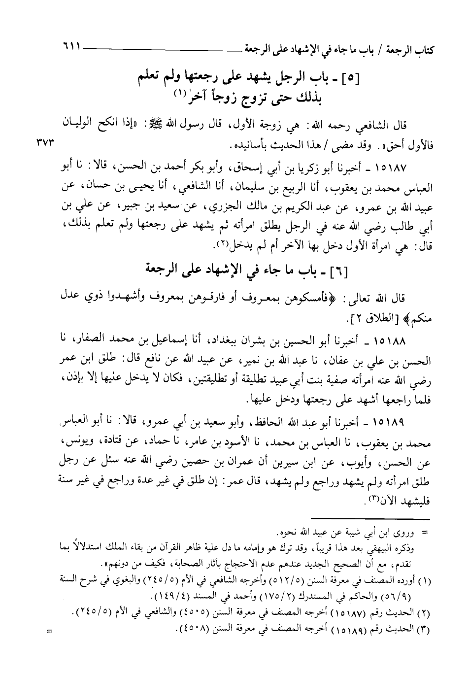 15188 - أَخْبَرَنَا أَبُو الْحُسَيْنِ بْنُ بِشْرَانَ، بِبَغْدَادَ أنا إِسْمَاعِيلُ بْنُ مُحَمَّدٍ الصَّفَّارُ، نا الْحَسَنُ بْنُ عَلِيِّ بْنِ عَفَّانَ، نا عَبْدُ اللهِ بْنُ نُمَيْرٍ، عَنْ عُبَيْدِ اللهِ، عَنْ نَافِعٍ قَالَ: طَلَّقَ ابْنُ عُمَرَ رَضِيَ اللهُ عَنْهُ امْرَأَتَهُ صَفِيَّةَ بِنْتَ أَبِي عُبَيْدٍ تَطْلِيقَةً أَوْ تَطْلِيقَتَيْنِ " §فَكَانَ لَا يَدْخُلُ عَلَيْهَا إِلَّا بِإِذْنٍ، فَلَمَّا رَاجَعَهَا أَشْهَدَ عَلَى رَجْعَتِهَا وَدَخَلَ عَلَيْهَا "