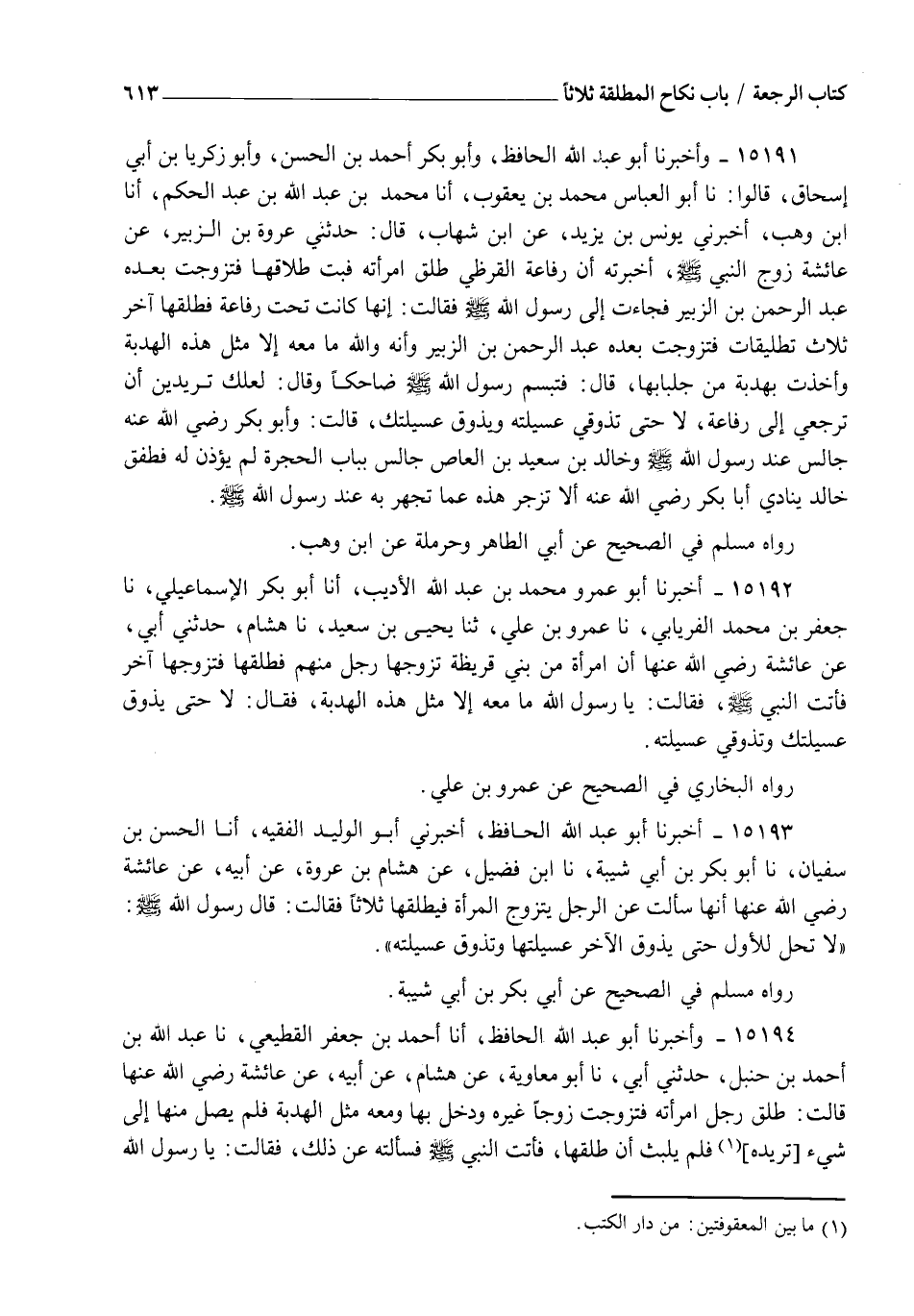 15193 - أَخْبَرَنَا أَبُو عَبْدِ اللهِ الْحَافِظُ، أَخْبَرَنِي أَبُو الْوَلِيدِ الْفَقِيهُ، أنا الْحَسَنُ بْنُ سُفْيَانَ، نا أَبُو بَكْرِ بْنُ أَبِي شَيْبَةَ، نا ابْنُ فُضَيْلٍ، عَنْ هِشَامِ بْنِ عُرْوَةَ، عَنْ أَبِيهِ، عَنْ عَائِشَةَ رَضِيَ اللهُ عَنْهَا أَنَّهَا سَأَلَتْ عَنِ الرَّجُلِ يَتَزَوَّجُ الْمَرْأَةَ فَيُطَلِّقُهَا ثَلَاثًا، فَقَالَتْ: قَالَ رَسُولُ اللهِ صَلَّى اللهُ عَلَيْهِ وَسَلَّمَ: §" لَا تَحِلُّ لِلْأَوَّلِ حَتَّى يَذُوقَ الْآخَرُ عُسَيْلَتَهَا وَتَذُوقَ عُسَيْلَتَهُ " رَوَاهُ مُسْلِمٌ فِي الصَّحِيحِ عَنْ أَبِي بَكْرِ بْنِ أَبِي شَيْبَةَ