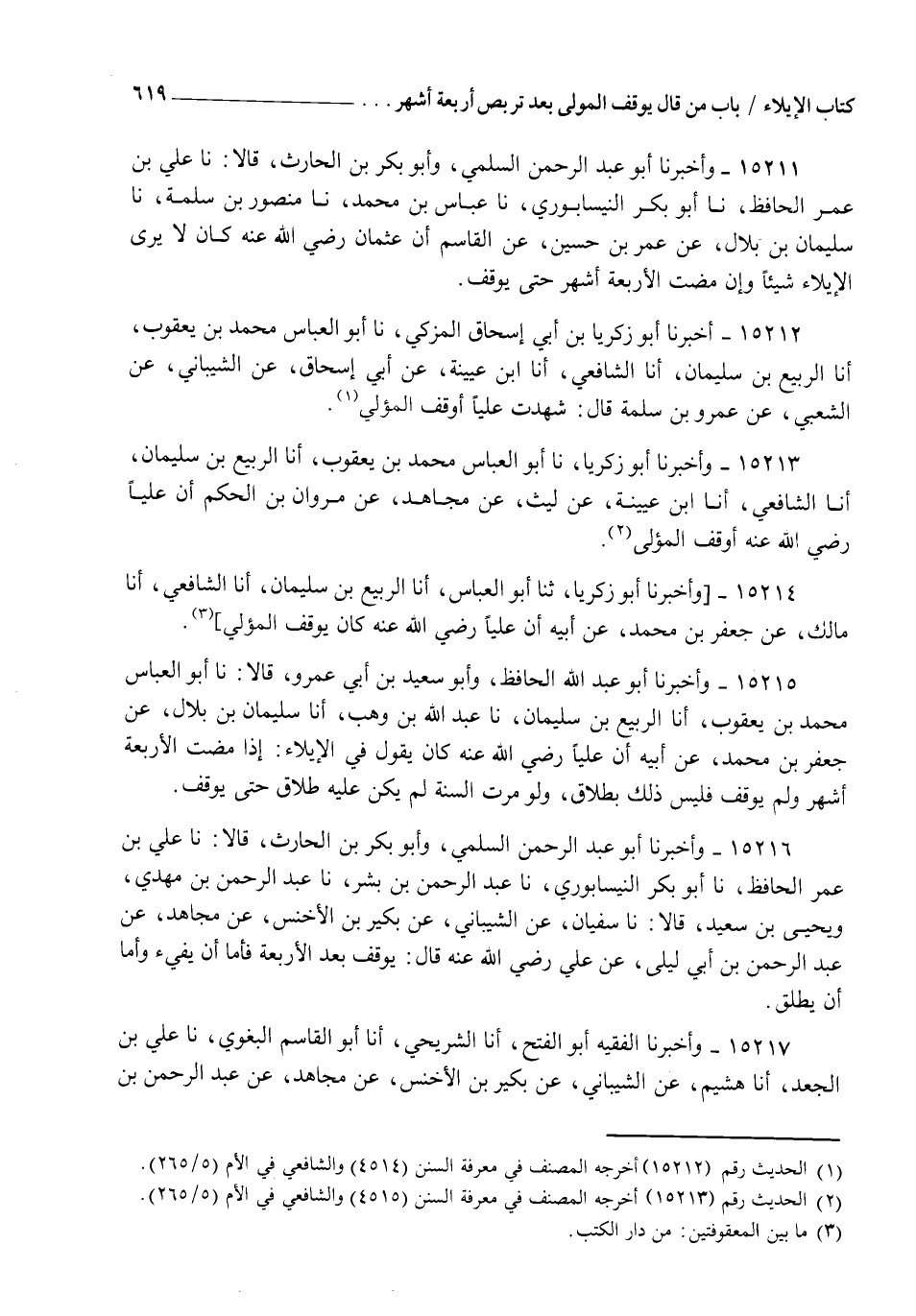 15212 - أَخْبَرَنَا أَبُو زَكَرِيَّا بْنُ أَبِي إِسْحَاقَ الْمُزَكِّي، نا أَبُو الْعَبَّاسِ مُحَمَّدُ بْنُ يَعْقُوبَ أنا الرَّبِيعُ بْنُ سُلَيْمَانَ، أنا الشَّافِعِيُّ، أنا ابْنُ عُيَيْنَةَ، عَنْ أَبِي إِسْحَاقَ، عَنِ الشَّيْبَانِيِّ، عَنِ الشَّعْبِيِّ، عَنْ عَمْرِو بْنِ سَلَمَةَ قَالَ: شَهِدْتُ عَلِيًّا §" أَوْقَفَ الْمُؤْلِيَ "