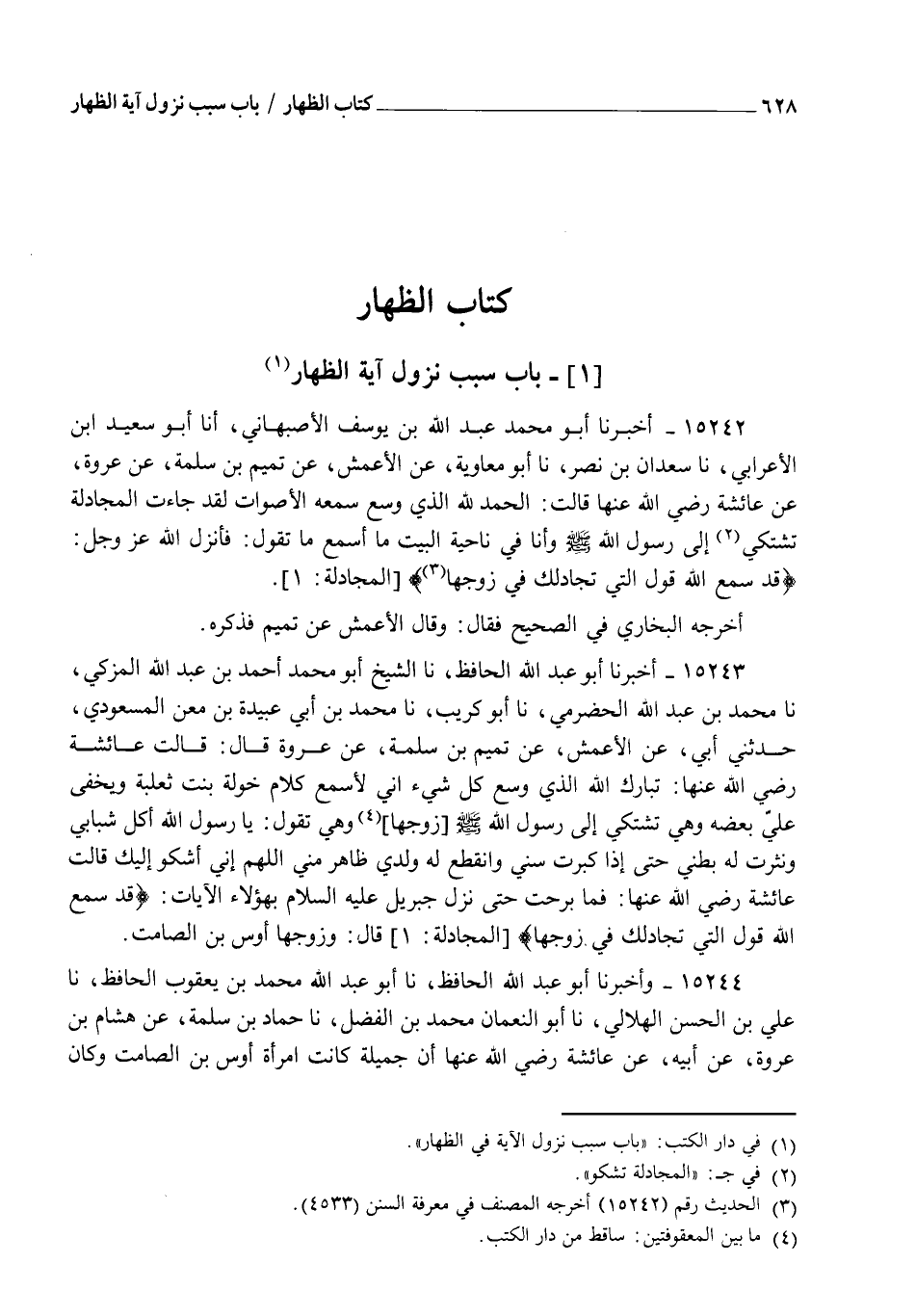 15242 - أَخْبَرَنَا أَبُو مُحَمَّدٍ عَبْدُ اللهِ بْنُ يُوسُفَ الْأَصْبَهَانِيُّ، أنا أَبُو سَعِيدِ بْنُ الْأَعْرَابِيِّ، نا سَعْدَانُ بْنُ نَصْرٍ، نا أَبُو مُعَاوِيَةَ، عَنِ الْأَعْمَشِ، عَنْ تَمِيمِ بْنِ سَلَمَةَ، عَنْ عُرْوَةَ، عَنْ عَائِشَةَ رَضِيَ اللهُ عَنْهَا قَالَتْ: الْحَمْدُ لِلَّهِ الَّذِي وَسِعَ سَمْعُهُ الْأَصْوَاتَ لَقَدْ §جَاءَتِ الْمُجَادِلَةُ تَشْتَكِي إِلَى رَسُولِ اللهِ صَلَّى اللهُ عَلَيْهِ وَسَلَّمَ وَأَنَا فِي نَاحِيَةِ الْبَيْتِ مَا أَسْمَعُ مَا تَقُولُ , فَأَنْزَلَ اللهُ عَزَّ وَجَلَّ {قَدْ سَمِعَ اللهُ قَوْلَ الَّتِي تُجَادِلُكَ فِي زَوْجِهَا} [المجادلة: 1] أَخْرَجَهُ الْبُخَارِيُّ فِي الصَّحِيحِ فَقَالَ: وَقَالَ الْأَعْمَشُ عَنْ تَمِيمٍ فَذَكَرَهُ
