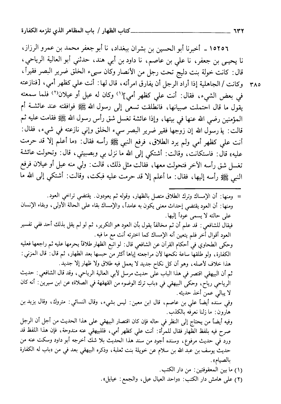 15256 - أَخْبَرَنَا أَبُو الْحُسَيْنِ بْنُ بِشْرَانَ، بِبَغْدَادَ نا أَبُو جَعْفَرٍ مُحَمَّدُ بْنُ عَمْرٍو الرَّزَّازُ نا يَحْيَى بْنُ جَعْفَرٍ، أنا عَلِيُّ بْنُ عَاصِمٍ، نا دَاوُدُ بْنُ أَبِي هِنْدٍ، حَدَّثَنِي أَبُو الْعَالِيَةِ الرِّيَاحِيُّ قَالَ: كَانَتْ خَوْلَةُ بِنْتُ دُلَيْجٍ تَحْتَ رَجُلٍ مِنَ الْأَنْصَارِ وَكَانَ سَيِّئَ الْخُلُقِ ضَرِيرَ الْبَصَرِ فَقِيرًا وَكَانَتِ الْجَاهِلِيَّةُ إِذَا أَرَادَ الرَّجُلُ أَنْ يُفَارِقَ امْرَأَتَهُ قَالَ لَهَا: أَنْتِ عَلَيَّ كَظَهْرِ أُمِّي , فَنَازَعَتْهُ فِي بَعْضِ الشَّيْءِ فَقَالَ: أَنْتِ عَلَيَّ كَظَهْرِ أُمِّي وَكَانَ لَهُ عَيِّلٌ أَوْ عَيِّلَانِ، فَلَمَّا سَمِعَتْهُ يَقُولُ مَا قَالَ احْتَمَلَتْ صِبْيَانَهَا فَانْطَلَقَتْ تَسْعَى إِلَى رَسُولِ اللهِ صَلَّى اللهُ عَلَيْهِ وَسَلَّمَ فَوَافَقَتْهُ عِنْدَ عَائِشَةَ أُمِّ الْمُؤْمِنِينَ رَضِيَ اللهُ عَنْهَا فِي بَيْتِهَا وَإِذَا عَائِشَةُ تَغْسِلُ شِقَّ رَأْسِ رَسُولِ اللهِ صَلَّى اللهُ عَلَيْهِ وَسَلَّمَ فَقَامَتْ عَلَيْهِ ثُمَّ قَالَتْ: يَا رَسُولَ اللهِ إِنَّ زَوْجِي فَقِيرٌ ضَرِيرُ الْبَصَرِ سَيِّئُ الْخُلُقِ وَإِنِّي نَازَعْتُهُ فِي شَيْءٍ فَقَالَ: §أَنْتِ عَلَيَّ كَظَهْرِ أُمِّي وَلَمْ يُرِدِ الطَّلَاقَ فَرَفَعَ النَّبِيُّ صَلَّى اللهُ عَلَيْهِ وَسَلَّمَ رَأْسَهُ فَقَالَ: " مَا أَعْلَمُ إِلَّا قَدْ حُرِّمْتِ عَلَيْهِ " قَالَ: فَاسْتَكَانَتْ وَقَالَتْ: أَشْتَكِي إِلَى اللهِ مَا نَزَلَ بِي وَبِصِبْيَتِي قَالَ: وَتَحَوَّلَتْ عَائِشَةُ تَغْسِلُ شِقَّ رَأْسِهِ الْآخَرَ فَتَحَوَّلَتْ مَعَهَا فَقَالَتْ مِثْلَ ذَلِكَ قَالَتْ: وَلِي مِنْهُ عَيِّلٌ أَوْ عَيِّلَانِ , فَرَفَعَ النَّبِيُّ صَلَّى اللهُ عَلَيْهِ وَسَلَّمَ رَأْسَهُ إِلَيْهَا فَقَالَ: " مَا أَعْلَمُ إِلَّا قَدْ حُرِّمْتِ عَلَيْهِ " , فَبَكَتْ وَقَالَتْ: أَشْتَكِي إِلَى اللهِ مَا -[633]- نَزَلَ بِي وَبِصِبْيَتِي , وَتَغَيَّرَ وَجْهُ رَسُولِ اللهِ صَلَّى اللهُ عَلَيْهِ وَسَلَّمَ فَقَالَتْ عَائِشَةُ رَضِيَ اللهُ عَنْهَا: وَرَاءَكِ فَتَنَحَّتْ وَمَكَثَ رَسُولُ اللهِ صَلَّى اللهُ عَلَيْهِ وَسَلَّمَ مَا شَاءَ اللهُ ثُمَّ انْقَطَعَ الْوَحْيُ، فَقَالَ: " يَا عَائِشَةُ أَيْنَ الْمَرْأَةُ؟ " قَالَتْ: هَا هِيَ هَذِهِ قَالَ: " ادْعِيهَا " فَدَعَتْهَا فَقَالَ النَّبِيُّ صَلَّى اللهُ عَلَيْهِ وَسَلَّمَ: " اذْهَبِي فَجِيئِي بِزَوْجِكِ " قَالَ: فَانْطَلَقَتْ تَسْعَى فَلَمْ تَلْبَثْ أَنْ جَاءَتْ بِهِ فَأَدْخَلَتْهُ عَلَى النَّبِيِّ صَلَّى اللهُ عَلَيْهِ وَسَلَّمَ فَإِذَا هُوَ كَمَا قَالَتْ ضَرِيرُ الْبَصَرِ، فَقِيرٌ، سَيِّئُ الْخُلُقِ , فَقَالَ النَّبِيُّ صَلَّى اللهُ عَلَيْهِ وَسَلَّمَ: " أَسْتَعِيذُ بِالسَّمِيعِ الْعَلِيمِ مِنَ الشَّيْطَانِ الرَّجِيمِ بِسْمِ اللهِ الرَّحْمَنِ الرَّحِيمِ {قَدْ سَمِعَ اللهُ قَوْلَ الَّتِي تُجَادِلُكَ فِي زَوْجِهَا وَتَشْتَكِي إِلَى اللهِ} [المجادلة: 1] إِلَى آخِرِ الْآيَةِ , فَقَالَ لَهُ النَّبِيُّ صَلَّى اللهُ عَلَيْهِ وَسَلَّمَ: " أَتَجِدُ عِتْقَ رَقَبَةٍ؟ " قَالَ: لَا قَالَ: " أَفَتَسْتَطِيعُ صَوْمَ شَهْرَيْنِ مُتَتَابِعَيْنِ؟ " قَالَ لَهُ: وَالَّذِي بَعَثَكَ بِالْحَقِّ إِذَا لَمْ آكُلِ الْمَرَّةَ وَالْمَرَّتَيْنِ وَالثَّلَاثَ يَكَادُ أَنْ يَغْشُوَ بَصَرِي قَالَ: " فَتَسْتَطِيعُ أَنْ تُطْعِمَ سِتِّينَ مِسْكِينًا؟ " قَالَ: لَا إِلَّا أَنْ تُعِينَنِي فِيهَا , قَالَ: فَدَعَا بِهِ رَسُولُ اللهِ صَلَّى اللهُ عَلَيْهِ وَسَلَّمَ فَكَفَّرَ يَمِينَهُ هَذَا مُرْسَلٌ وَلَكِنْ لَهُ شَوَاهِدُ وَاللهُ أَعْلَمُ