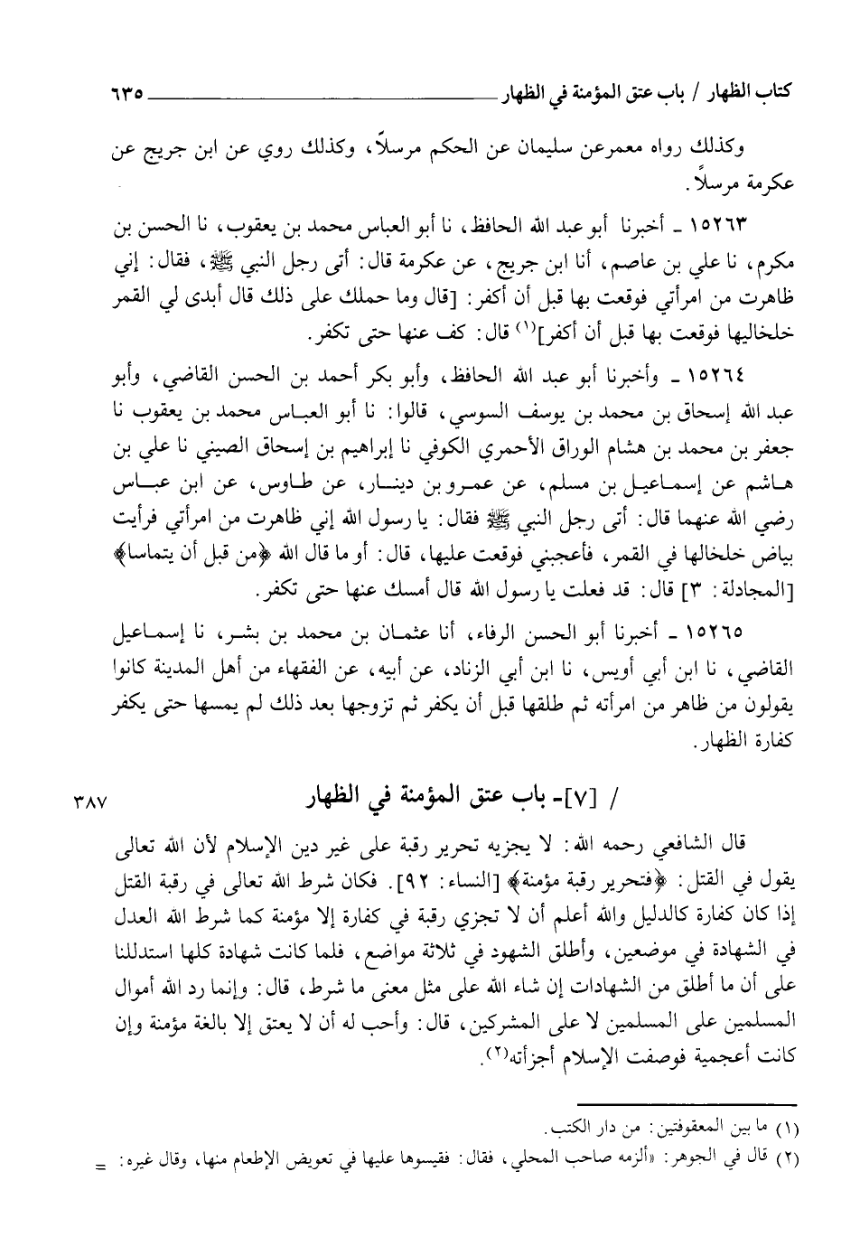 15264 - وَأَخْبَرَنَا أَبُو عَبْدِ اللهِ الْحَافِظُ، وَأَبُو بَكْرٍ أَحْمَدُ بْنُ الْحَسَنِ الْقَاضِي، وَأَبُو عَبْدِ اللهِ إِسْحَاقُ بْنُ مُحَمَّدِ بْنِ يُوسُفَ السُّوسِيُّ قَالُوا: نا أَبُو الْعَبَّاسِ مُحَمَّدُ بْنُ يَعْقُوبَ نا جَعْفَرُ بْنُ مُحَمَّدِ بْنِ هِشَامٍ الْوَرَّاقُ الْأَحْمَرِيُّ الْكُوفِيُّ، نا إِبْرَاهِيمُ بْنُ إِسْحَاقَ الصِّينِيُّ، نا عَلِيُّ بْنُ هَاشِمٍ، عَنْ إِسْمَاعِيلَ بْنِ مُسْلِمٍ، عَنْ عَمْرِو بْنِ دِينَارٍ، عَنْ طَاوُسٍ، عَنِ ابْنِ عَبَّاسٍ رَضِيَ اللهُ عَنْهُمَا قَالَ: أَتَى رَجُلٌ النَّبِيَّ صَلَّى اللهُ عَلَيْهِ وَسَلَّمَ فَقَالَ: يَا رَسُولَ اللهِ إِنِّي §ظَاهَرْتُ مِنِ امْرَأَتِي فَرَأَيْتُ بَيَاضَ خَلْخَالِهَا فِي الْقَمَرِ فَأَعْجَبَنِي فَوَقَعْتُ عَلَيْهَا قَالَ: " أَوَ مَا قَالَ اللهُ: {مِنْ قَبْلِ أَنْ يَتَمَاسَّا} [المجادلة: 3]؟ " قَالَ: قَدْ فَعَلْتُ يَا رَسُولَ اللهِ قَالَ: " أَمْسِكْ عَنْهَا حَتَّى تُكَفِّرَ "