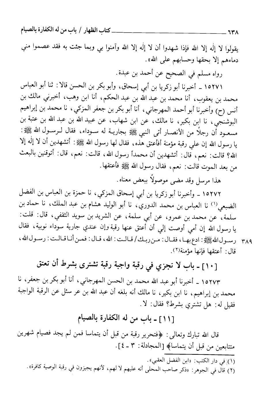 15271 - أَخْبَرَنَا أَبُو زَكَرِيَّا بْنُ أَبِي إِسْحَاقَ، وَأَبُو بَكْرِ بْنُ الْحَسَنِ قَالَا: ثنا أَبُو الْعَبَّاسِ مُحَمَّدُ بْنُ يَعْقُوبَ أنا مُحَمَّدُ بْنُ عَبْدِ اللهِ بْنِ عَبْدِ الْحَكَمِ، أنا ابْنُ وَهْبٍ، أَخْبَرَنِي مَالِكُ بْنُ أَنَسٍ، ح وَأَخْبَرَنَا أَبُو أَحْمَدَ الْمِهْرَجَانِيُّ، أنا أَبُو بَكْرِ بْنُ جَعْفَرٍ الْمُزَكِّي، نا مُحَمَّدُ بْنُ إِبْرَاهِيمَ الْبُوشَنْجِيُّ، نا ابْنُ بُكَيْرٍ، نا مَالِكٌ، عَنِ ابْنِ شِهَابٍ، عَنْ عُبَيْدِ اللهِ بْنِ عَبْدِ اللهِ بْنِ عُتْبَةَ بْنِ مَسْعُودٍ، أَنَّ رَجُلًا مِنَ الْأَنْصَارِ أَتَى النَّبِيَّ صَلَّى اللهُ عَلَيْهِ وَسَلَّمَ بِجَارِيَةٍ لَهُ سَوْدَاءَ فَقَالَ لِرَسُولِ اللهِ صَلَّى اللهُ عَلَيْهِ وَسَلَّمَ: يَا رَسُولَ اللهِ إِنَّ §عَلَيَّ رَقَبَةً مُؤْمِنَةً أَفَأُعْتِقُ هَذِهِ؟ فَقَالَ لَهَا رَسُولُ اللهِ صَلَّى اللهُ عَلَيْهِ وَسَلَّمَ: " أَتَشْهَدِينَ أَنْ لَا إِلَهَ إِلَّا اللهُ؟ " قَالَتْ: نَعَمْ، قَالَ: " أَتَشْهَدِينَ أَنَّ مُحَمَّدًا رَسُولُ اللهِ؟ " قَالَتْ: نَعَمْ، قَالَ: " أَتُوقِنِينَ بِالْبَعْثِ مِنْ بَعْدِ الْمَوْتِ؟ " قَالَتْ: نَعَمْ، فَقَالَ: رَسُولُ اللهِ صلَّى الله عَلَيْهِ وَسَلَّمَ: " فَأَعْتِقْهَا " هَذَا مُرْسَلٌ وَقَدْ مَضَى مَوْصُولًا بِبَعْضِ مَعْنَاهُ