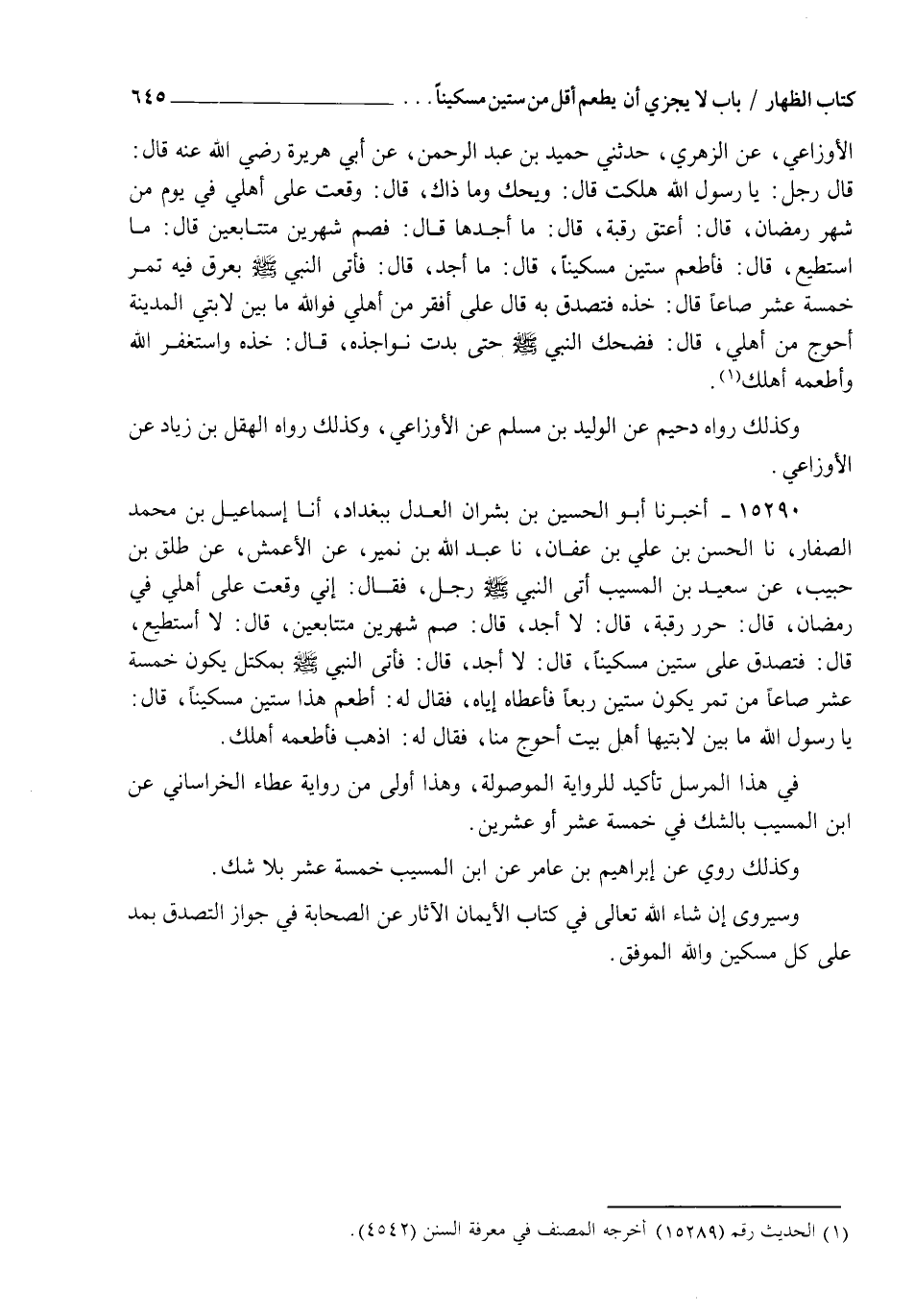 15290 - أَخْبَرَنَا أَبُو الْحُسَيْنِ بْنُ بِشْرَانَ الْعَدْلُ، بِبَغْدَادَ أنا إِسْمَاعِيلُ بْنُ مُحَمَّدٍ الصَّفَّارُ، نا الْحَسَنُ بْنُ عَلِيِّ بْنِ عَفَّانَ، نا عَبْدُ اللهِ بْنُ نُمَيْرٍ، عَنِ الْأَعْمَشِ، عَنْ طَلْقِ بْنِ حَبِيبٍ، عَنْ سَعِيدِ بْنِ الْمُسَيِّبِ، أَتَى النَّبِيَّ صَلَّى اللهُ عَلَيْهِ وَسَلَّمَ رَجُلٌ فَقَالَ: إِنِّي وَقَعْتُ عَلَى أَهْلِي فِي رَمَضَانَ قَالَ: " §حَرِّرْ رَقَبَةً " قَالَ: لَا أَجِدُ قَالَ: " صُمْ شَهْرَيْنِ مُتَتَابِعَيْنِ " قَالَ: لَا أَسْتَطِيعُ قَالَ: " فَتَصَدَّقْ عَلَى سِتِّينَ مِسْكِينًا " قَالَ: لَا أَجِدُ، قَالَ: فَأُتِيَ النَّبِيُّ صَلَّى اللهُ عَلَيْهِ وَسَلَّمَ بِمِكْتَلٍ يَكُونُ خَمْسَةَ عَشَرَ صَاعًا مِنْ تَمْرٍ يَكُونُ سِتِّينَ رَبْعًا فَأَعْطَاهُ إِيَّاهُ فَقَالَ لَهُ: " أَطْعِمْ هَذَا سِتِّينَ مِسْكِينًا " قَالَ: يَا رَسُولَ اللهِ مَا بَيْنَ لَابَتَيْهَا أَهْلُ بَيْتٍ أَحْوَجُ مِنَّا , فَقَالَ لَهُ: " اذْهَبْ فَأَطْعِمْهُ أَهْلَكَ " فِي هَذَا الْمُرْسَلِ تَأْكِيدٌ لِلرِّوَايَةِ الْمَوْصُولَةِ , وَهَذَا أَوْلَى مِنْ رِوَايَةِ عَطَاءٍ الْخُرَاسَانِيِّ عَنِ ابْنِ الْمُسَيِّبِ بِالشَّكِّ فِي خَمْسَةَ عَشَرَ أَوْ عِشْرِينَ , وَكَذَلِكَ رُوِيَ عَنْ إِبْرَاهِيمَ بْنِ عَامِرٍ عَنِ ابْنِ الْمُسَيِّبِ خَمْسَةَ عَشَرَ بِلَا شَكٍّ , وَسَيُرْوَى إِنْ شَاءَ اللهُ تَعَالَى فِي كِتَابِ الْأَيْمَانِ الْآثَارُ عَنِ الصَّحَابَةِ فِي جَوَازِ التَّصْدِقِ بِمُدٍّ عَلَى كُلِّ مِسْكِينٍ وَاللهُ الْمُوَفِّقُ