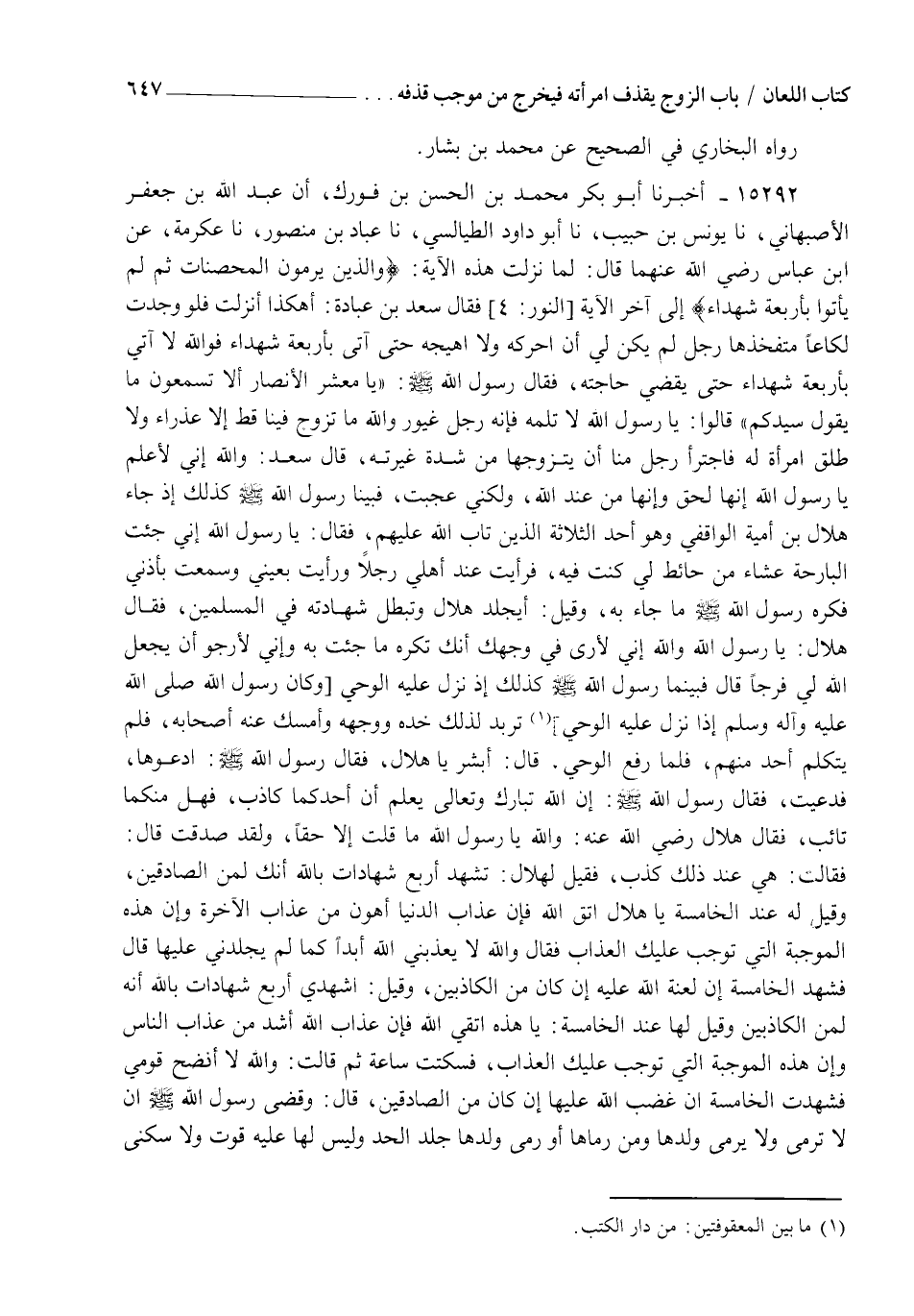 15292 - أَخْبَرَنَا أَبُو بَكْرٍ مُحَمَّدُ بْنُ الْحَسَنِ بْنِ فُورَكٍ أنا عَبْدَ اللهِ بْنَ جَعْفَرٍ الْأَصْبَهَانِيَّ، نا يُونُسُ بْنُ حَبِيبٍ، نا أَبُو دَاوُدَ الطَّيَالِسِيُّ، نا عَبَّادُ بْنُ مَنْصُورٍ، نا عِكْرِمَةُ، عَنِ ابْنِ عَبَّاسٍ رَضِيَ اللهُ عَنْهُمَا قَالَ: لَمَّا نَزَلَتْ هَذِهِ الْآيَةُ {§وَالَّذِينَ يَرْمُونَ الْمُحْصَنَاتِ ثُمَّ لَمْ يَأْتُوا بِأَرْبَعَةِ شُهَدَاءَ} [النور: 4] إِلَى آخِرِ الْآيَةِ فَقَالَ سَعْدُ بْنُ عُبَادَةَ: أَهَكَذَا أُنْزِلَتْ فَلَوْ وَجَدْتُ لَكَاعًا مُتَفَخِّذُهَا رَجُلٌ لَمْ يَكُنْ لِي أَنْ أُحَرِّكَهُ وَلَا أَهِيجَهُ حَتَّى آتِيَ بِأَرْبَعَةِ شُهَدَاءَ، فَوَاللهِ لَا آتِي بِأَرْبَعَةِ شُهَدَاءَ حَتَّى يَقْضِيَ حَاجَتَهُ , فَقَالَ رَسُولُ اللهِ صلَّى الله عَلَيْهِ وَسَلَّمَ: " يَا مَعْشَرَ الْأَنْصَارِ أَلَا تَسْمَعُونَ مَا يَقُولُ سَيِّدِكُمْ؟ " قَالُوا: يَا رَسُولَ اللهِ لَا تَلُمْهُ فَإِنَّهُ رَجُلٌ غَيُورٌ وَاللهِ مَا تَزَوَّجَ فِينَا قَطُّ إِلَّا عَذْرَاءَ وَلَا طَلَّقَ امْرَأَةً لَهُ فَاجْتَرَأَ رَجُلٌ مِنَّا أَنْ يَتَزَوَّجَهَا مِنْ شِدَّةِ غَيْرَتِهِ , قَالَ سَعْدٌ: وَاللهِ إِنِّي لَأَعْلَمُ يَا رَسُولَ اللهِ أَنَّهَا لَحَقٌّ وَأَنَّهَا مِنْ عِنْدِ اللهِ وَلَكِنِّي عَجِبْتُ , فَبَيْنَا رَسُولُ اللهِ صَلَّى اللهُ عَلَيْهِ وَسَلَّمَ كَذَلِكَ إِذْ جَاءَ هِلَالُ بْنُ أُمَيَّةَ الْوَاقِفِيُّ وَهُوَ أَحَدُ الثَّلَاثَةِ الَّذِينَ تَابَ اللهُ عَلَيْهِمْ، فَقَالَ: يَا رَسُولَ اللهِ إِنِّي جِئْتُ الْبَارِحَةَ عِشَاءً مِنْ حَائِطٍ لِي كُنْتُ فِيهِ فَرَأَيْتُ عِنْدَ أَهْلِي رَجُلًا وَرَأَيْتُ بِعَيْنِيَّ وَسَمِعْتُ بِأُذُنِيَّ , فَكَرِهَ رَسُولُ اللهِ صَلَّى اللهُ عَلَيْهِ وَسَلَّمَ مَا جَاءَ بِهِ وَقِيلَ أَيُجْلَدُ هِلَالٌ وَتُبْطَلُ شَهَادَتُهُ فِي الْمُسْلِمِينَ؟ فَقَالَ هِلَالٌ: يَا رَسُولَ اللهِ وَاللهِ إِنِّي لَأَرَى فِي وَجْهِكَ أَنَّكَ تَكْرَهُ مَا جِئْتُ بِهِ , وَإِنِّي لَأَرْجُو أَنْ يَجْعَلَ اللهُ لِي فَرَجًا قَالَ: فَبَيْنَمَا رَسُولُ اللهِ صَلَّى اللهُ عَلَيْهِ وَسَلَّمَ كَذَلِكَ إِذْ نَزَلَ عَلَيْهِ الْوَحْيُ وَكَانَ رَسُولُ اللهِ صَلَّى الله عَلَيْهِ وآله وَسَلَّمَ إِذَا نَزَلَ عَلَيْهِ الْوَحْيُ تَرَبَّدَ لِذَلِكَ خَدُّهُ وَوَجْهُهُ وَأَمْسَكَ عَنْهُ أَصْحَابُهُ فَلَمْ يَتَكَلَّمْ أَحَدٌ مِنْهُمْ، فَلَمَّا رُفِعَ الْوَحْيُ قَالَ: أَبْشِرْ يَا هِلَالُ فَقَالَ رَسُولُ اللهِ صلَّى الله عَلَيْهِ وَسَلَّمَ: " ادْعُوهَا " فَدُعِيَتْ فَقَالَ رَسُولُ اللهِ صلَّى الله عَلَيْهِ وَسَلَّمَ: إِنَّ اللهَ تَبَارَكَ وَتَعَالَى يَعْلَمُ أَنَّ أَحَدَكُمَا كَاذِبٌ فَهَلْ مِنْكُمَا تَائِبٌ؟ " فَقَالَ هِلَالٌ رَضِيَ اللهُ عَنْهُ: وَاللهِ يَا رَسُولَ اللهِ مَا قُلْتُ إِلَّا حَقًّا وَلَقَدْ صَدَقْتُ , قَالَ: فَقَالَتْ هِيَ عِنْدَ ذَلِكَ: كَذَبَ، قَالَ: فَقِيلَ لِهِلَالٍ: تَشْهَدُ أَرْبَعَ شَهَادَاتٍ بِاللهِ أَنَّكَ لَمِنَ الصَّادِقِينَ , وَقِيلَ لَهُ عِنْدَ الْخَامِسَةِ يَا هِلَالُ اتَّقِ اللهَ فَإِنَّ عَذَابَ الدُّنْيَا أَهْوَنُ مِنْ عَذَابِ الْآخِرَةِ وَإِنَّ هَذِهِ الْمُوجِبَةُ الَّتِي تُوجِبُ عَلَيْكَ الْعَذَابَ , فَقَالَ: وَاللهِ لَا يُعَذِّبُنِي اللهُ أَبَدًا كَمَا لَمْ يَجْلِدْنِي عَلَيْهَا , قَالَ: فَشَهِدَ الْخَامِسَةَ أَنَّ لَعْنَةَ اللهِ عَلَيْهِ إِنْ كَانَ مِنَ الْكَاذِبِينَ وَقِيلَ: اشْهَدِي أَرْبَعَ شَهَادَاتٍ بِاللهِ أَنَّهُ لَمِنَ الْكَاذِبِينَ وَقِيلَ لَهَا عِنْدَ الْخَامِسَةِ: يَا هَذِهِ اتَّقِي اللهَ فَإِنَّ عَذَابَ اللهِ أَشَدُّ مِنْ عَذَابِ النَّاسِ وَإِنَّ هَذِهِ الْمُوجِبَةُ الَّتِي تُوجِبُ عَلَيْكِ الْعَذَابَ , فَسَ