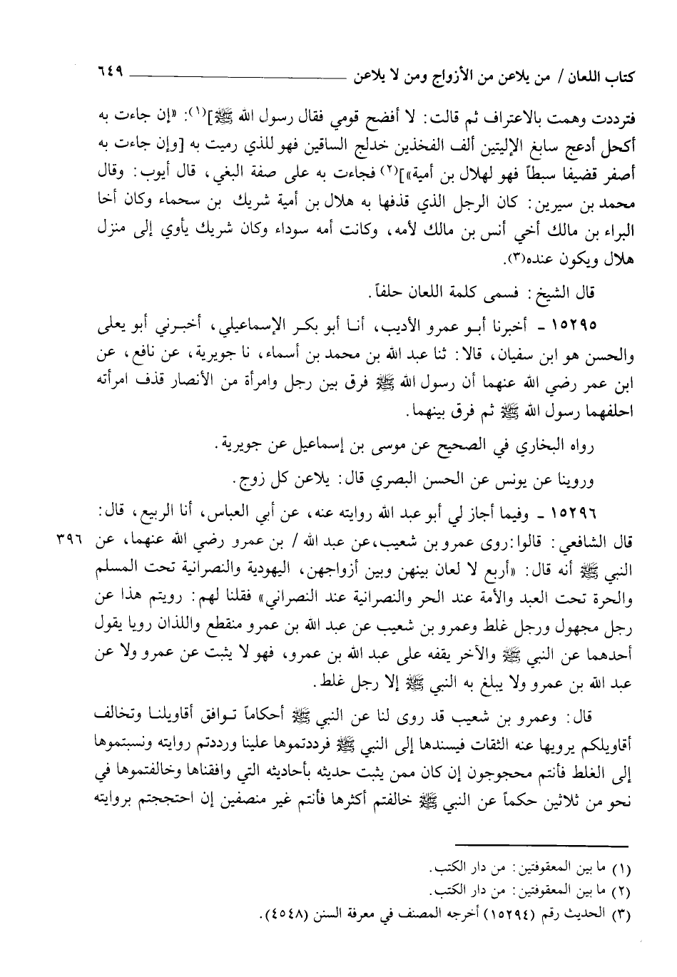 15296 - وَفِيمَا أَجَازَ لِي أَبُو عَبْدِ اللهِ رِوَايَتَهُ عَنْهُ عَنْ أَبِي الْعَبَّاسِ، أنا الرَّبِيعُ قَالَ: قَالَ الشَّافِعِيُّ قَالُوا: رَوَى عَمْرُو بْنُ شُعَيْبٍ، عَنْ عَبْدِ اللهِ بْنِ عَمْرٍو رَضِيَ اللهُ عَنْهُمَا عَنِ النَّبِيِّ صَلَّى اللهُ عَلَيْهِ وَسَلَّمَ أَنَّهُ قَالَ: " §أَرْبَعٌ لَا لِعَانَ بَيْنَهُنَّ وَبَيْنَ أَزْوَاجِهِنَّ، الْيَهُودِيَّةُ وَالنَّصْرَانِيَّةُ تَحْتَ الْمُسْلِمِ، وَالْحُرَّةُ تَحْتَ الْعَبْدِ، وَالْأَمَةُ عِنْدَ الْحُرِّ، وَالنَّصْرَانِيَّةُ عِنْدَ النَّصْرَانِيِّ " فَقُلْنَا لَهُمْ: رَوَيْتُمْ هَذَا عَنْ رَجُلٍ مَجْهُولٍ وَرَجُلٍ غَلَطَ وَعَمْرُو بْنُ شُعَيْبٍ عَنْ عَبْدِ اللهِ بْنِ عَمْرٍو مُنْقَطِعٌ وَاللَّذَانِ رَوَيَا يَقُولُ أَحَدُهُمَا عَنِ النَّبِيِّ صَلَّى اللهُ عَلَيْهِ وَسَلَّمَ وَالْآخَرُ يَقِفُهُ عَلَى عَبْدِ اللهِ بْنِ عَمْرٍو فَهُوَ لَا يَثْبُتُ عَنْ عَمْرٍو وَلَا عَنْ عَبْدِ اللهِ بْنِ عَمْرٍو وَلَا يَبْلُغُ بِهِ النَّبِيَّ صَلَّى اللهُ عَلَيْهِ وَسَلَّمَ إِلَّا رَجُلٌ غَلِطَ قَالَ: وَعَمْرُو بْنُ شُعَيْبٍ قَدْ رَوَى لَنَا عَنِ النَّبِيِّ صَلَّى اللهُ عَلَيْهِ وَسَلَّمَ أَحْكَامًا تُوَافِقُ أَقَاوِيلَنَا وَتُخَالِفُ أَقَاوِيلَكُمْ يَرْوِيهَا عَنْهُ الثِّقَاتُ فَيُسْنِدُهَا إِلَى النَّبِيِّ صَلَّى اللهُ عَلَيْهِ وَسَلَّمَ فَرَدَدْتُمُوهَا عَلَيْنَا وَرَدَدْتُمْ رِوَايَتَهُ وَنَسَبْتُمُوهَا إِلَى الْغَلَطِ , فَأَنْتُمْ مَحْجُوجُونَ إِنْ كَانَ مِمَّنْ يَثْبُتُ حَدِيثُهُ بِأَحَادِيثِهِ الَّتِي وَافَقْنَاهَا وَخَالَفْتُمُوهَا فِي نَحْوٍ مِنْ ثَلَاثِينَ حُكْمًا عَنِ النَّبِيِّ صَلَّى اللهُ عَلَيْهِ وَسَلَّمَ , خَالَفْتُمْ أَكْثَرَهَا فَأَنْتُمْ غَيْرُ مُنْصِفِينَ إِنِ احْتَجَجْتُمْ بِرِوَايَتِهِ -[650]- وَهُوَ مِمَّنْ لَا نُثْبِتُ رِوَايَتَهُ ثُمَّ احْتَجَجْتُمْ مِنْهَا بِمَا لَوْ كَانَ ثَابِتًا عَنْهُ وَهُوَ مِمَّنْ يَثْبُتُ حَدِيثُهُ لَمْ نُثْبِتْهُ لِأَنَّهُ مُنْقَطِعٌ بَيْنَهُ وَبَيْنَ عَبْدِ اللهِ بْنِ عَمْرٍو