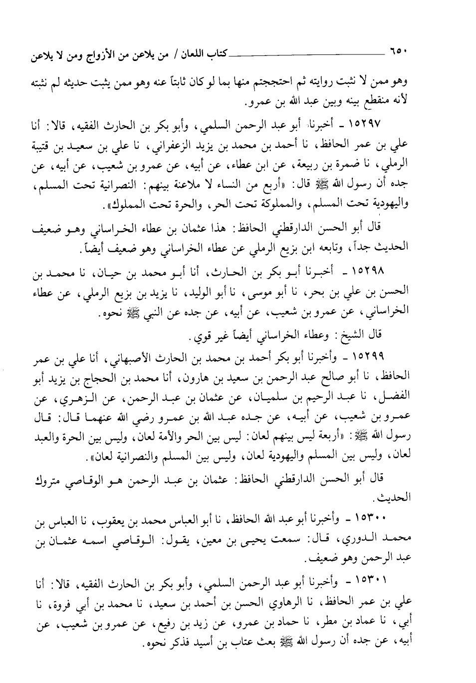 15299 - وَأَخْبَرَنَا أَبُو بَكْرٍ أَحْمَدُ بْنُ مُحَمَّدِ بْنِ الْحَارِثِ الْأَصْبَهَانِيُّ أنا عَلِيُّ بْنُ عُمَرَ الْحَافِظُ، نا أَبُو صَالِحٍ عَبْدُ الرَّحْمَنِ بْنُ سَعِيدِ بْنِ هَارُونَ، أنا مُحَمَّدُ بْنُ الْحَجَّاجِ بْنِ يَزِيدَ أَبُو الْفَضْلِ، نا عَبْدُ الرَّحِيمِ بْنُ سُلَيْمَانَ، عَنْ عُثْمَانَ بْنِ عَبْدِ الرَّحْمَنِ، عَنِ الزُّهْرِيِّ، عَنْ عَمْرِو بْنِ شُعَيْبٍ، عَنْ أَبِيهِ، عَنْ جَدِّهِ عَبْدِ اللهِ بْنِ عَمْرٍو رَضِيَ اللهُ عَنْهُمَا قَالَ: قَالَ رَسُولُ اللهِ صلَّى الله عَلَيْهِ وَسَلَّمَ: §" أَرْبَعَةٌ لَيْسَ بَيْنَهُمْ لِعَانٌ، لَيْسَ بَيْنَ الْحُرِّ وَالْأَمَةِ لِعَانٌ، وَلَيْسَ بَيْنَ الْحُرَّةِ وَالْعَبْدِ لِعَانٌ، وَلَيْسَ بَيْنَ الْمُسْلِمِ وَالْيَهُودِيَّةِ لِعَانٌ، وَلَيْسَ بَيْنَ الْمُسْلِمِ وَالنَّصْرَانِيَّةِ لِعَانٌ " قَالَ أَبُو الْحَسَنِ الدَّارَقُطْنِيُّ الْحَافِظُ: عُثْمَانُ بْنُ عَبْدِ الرَّحْمَنِ هُوَ الْوَقَّاصِيُّ مَتْرُوكُ الْحَدِيثِ.
