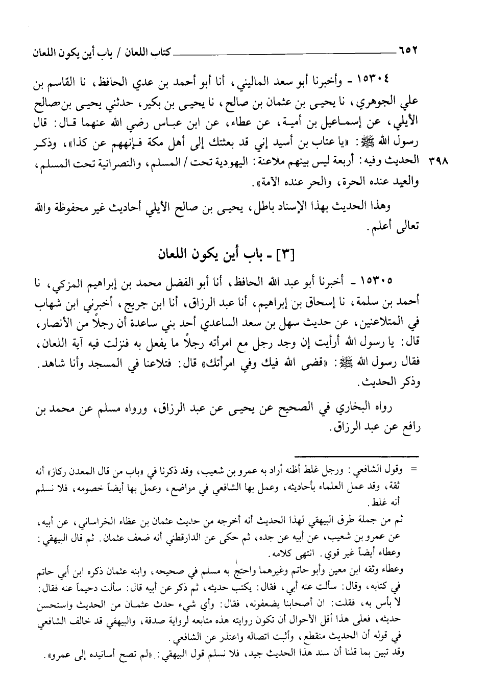 15304 - وَأَخْبَرَنَا أَبُو سَعْدٍ الْمَالِينِيُّ، أنا أَبُو أَحْمَدَ بْنُ عَدِيٍّ الْحَافِظُ، نا الْقَاسِمُ بْنُ عَلِيٍّ الْجَوْهَرِيُّ، نا يَحْيَى بْنُ عُثْمَانَ بْنِ صَالِحٍ، نا يَحْيَى بْنُ بُكَيْرٍ، حَدَّثَنِي يَحْيَى بْنُ صَالِحٍ الْأَيْلِيُّ، عَنْ إِسْمَاعِيلَ بْنِ أُمَيَّةَ، عَنْ عَطَاءٍ، عَنِ ابْنِ عَبَّاسٍ رَضِيَ اللهُ عَنْهُمَا قَالَ: قَالَ رَسُولُ اللهِ صلَّى الله عَلَيْهِ وَسَلَّمَ: " يَا عَتَّابُ بْنُ أَسِيدٍ إِنِّي قَدْ بَعَثْتُكَ إِلَى أَهْلِ مَكَّةَ فَانْهَهُمْ عَنْ كَذَا " , وَذَكَرَ الْحَدِيثَ وَفِيهِ " §أَرْبَعَةٌ لَيْسَ بَيْنَهُمْ مُلَاعَنَةٌ: الْيَهُودِيَّةُ تَحْتَ الْمُسْلِمِ، وَالنَّصْرَانِيَّةُ تَحْتَ الْمُسْلِمِ، وَالْعَبْدُ عِنْدَهُ الْحُرَّةُ، وَالْحُرُّ عِنْدَهُ الْأَمَةُ " وَهَذَا الْحَدِيثُ بِهَذَا الْإِسْنَادِ بَاطِلٌ , يَحْيَى بْنُ صَالِحٍ الْأَيْلِيُّ أَحَادِيثُهُ غَيْرُ مَحْفُوظَةٍ , وَاللهُ تَعَالَى أَعْلَمُ