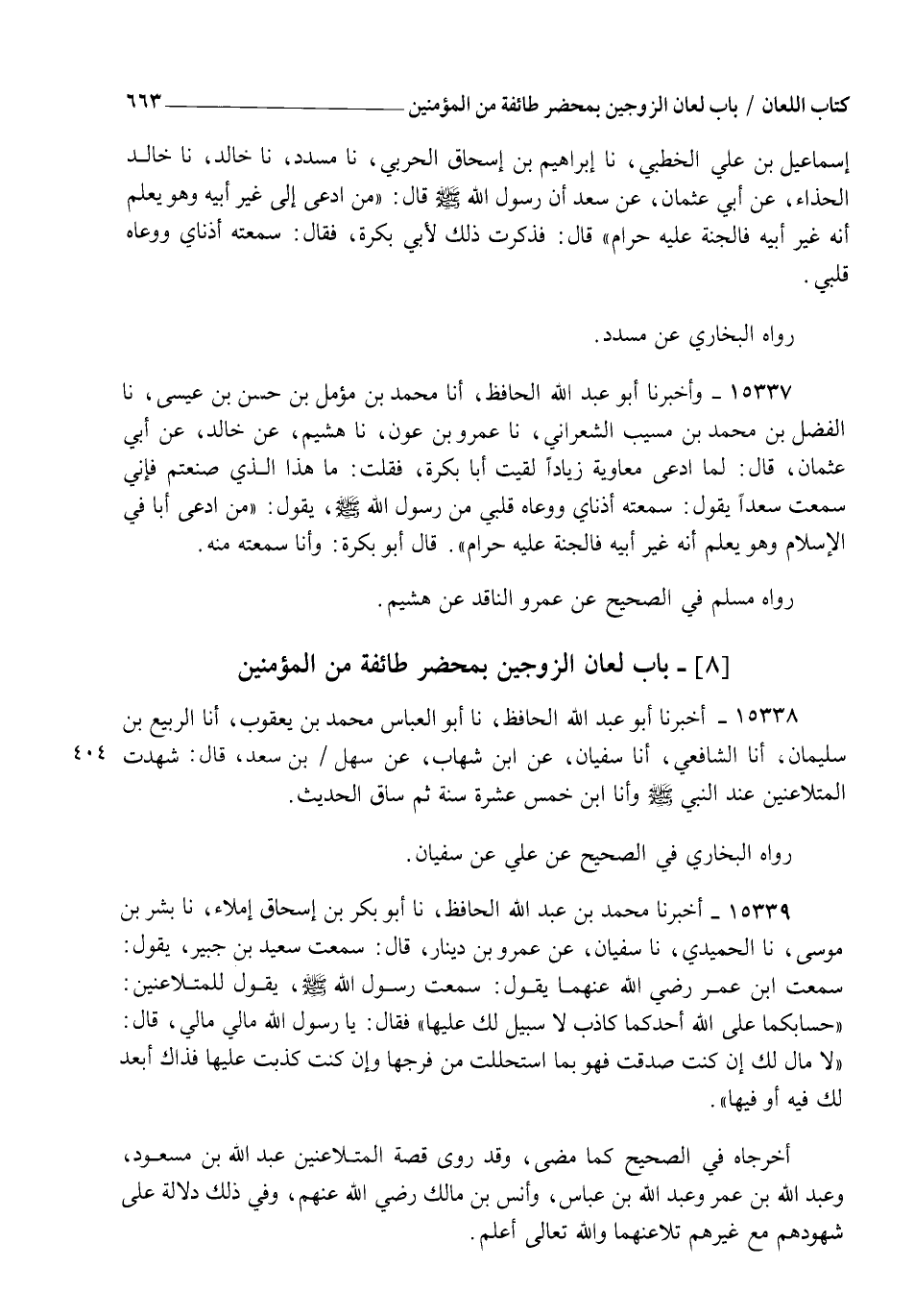 15338 - أَخْبَرَنَا أَبُو عَبْدِ اللهِ الْحَافِظُ، نا أَبُو الْعَبَّاسِ مُحَمَّدُ بْنُ يَعْقُوبَ أنا الرَّبِيعُ بْنُ سُلَيْمَانَ، أنا الشَّافِعِيُّ، أنا سُفْيَانُ، عَنِ ابْنِ شِهَابٍ، عَنْ سَهْلِ بْنِ سَعْدٍ قَالَ: §" شَهِدْتُ الْمُتَلَاعِنَيْنِ عِنْدَ النَّبِيِّ صَلَّى اللهُ عَلَيْهِ وَسَلَّمَ وَأَنَا ابْنُ خَمْسَ عَشْرَةَ سَنَةً " ثُمَّ سَاقَ الْحَدِيثَ، رَوَاهُ الْبُخَارِيُّ فِي الصَّحِيحِ عَنْ عَلِيٍّ عَنْ سُفْيَانَ