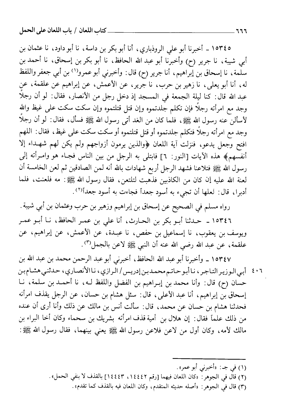 15346 - حَدَّثَنَا أَبُو بَكْرِ بْنُ الْحَارِثِ، أنا عَلِيُّ بْنُ عُمَرَ الْحَافِظُ، نا أَبُو عُمَرَ، وَيُوسُفُ بْنُ يَعْقُوبَ، نا إِسْمَاعِيلُ بْنُ حَفْصٍ، نا عَبْدَةُ، عَنِ الْأَعْمَشِ، عَنْ إِبْرَاهِيمَ، عَنْ عَلْقَمَةَ، عَنْ عَبْدِ اللهِ رَضِيَ اللهُ عَنْهُ أَنَّ النَّبِيَّ صَلَّى اللهُ عَلَيْهِ وَسَلَّمَ " §لَاعَنَ بِالْحَمْلِ "