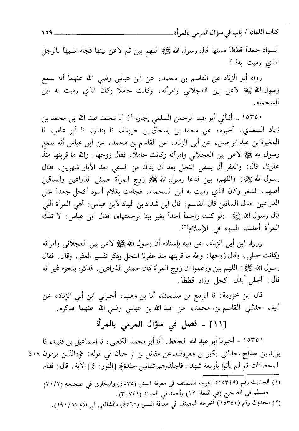 15350 - أَنْبَأَنِي أَبُو عَبْدِ الرَّحْمَنِ السُّلَمِيُّ إِجَازَةً أَنَّ أَبَا مُحَمَّدٍ عَبْدُ اللهِ بْنُ مُحَمَّدِ بْنِ زِيَادٍ السَّمْدِيُّ أَخْبَرَهُ، عَنْ مُحَمَّدِ بْنِ إِسْحَاقَ بْنِ خُزَيْمَةَ، نا بُنْدَارٌ، نا أَبُو عَامِرٍ، نا الْمُغِيرَةُ بْنُ عَبْدِ الرَّحْمَنِ، عَنْ أَبِي الزِّنَادِ، عَنِ الْقَاسِمِ بْنِ مُحَمَّدٍ، عَنِ ابْنِ عَبَّاسٍ، أَنَّهُ سَمِعَ رَسُولَ اللهِ صَلَّى اللهُ عَلَيْهِ وَسَلَّمَ " §لَاعَنَ بَيْنَ الْعَجْلَانِيِّ وَامْرَأَتِهِ وَكَانَتْ حَامِلًا "، فَقَالَ زَوْجُهَا: وَاللهِ مَا قَرَبْتُهَا مُنْذُ عَفَرْنَا قَالَ: وَالْعَفْرُ أَنْ يُسْقَى النَّخْلُ بَعْدَ أَنْ يُتْرَكَ مِنَ السَّقْيِ بَعْدَ الْإِبَّارِ شَهْرَيْنِ , فَقَالَ رَسُولُ اللهِ صلَّى الله عَلَيْهِ وَسَلَّمَ: " اللهُمَّ بَيِّنْ " فَدَعَا رَسُولُ اللهِ صَلَّى اللهُ عَلَيْهِ وَسَلَّمَ زَوْجَ الْمَرْأَةِ حَمْشَ الذِّرَاعَيْنِ وَالسَّاقَيْنِ أَصْهَبَ الشَّعْرِ وَكَانَ الَّذِي رُمِيَتْ بِهِ ابْنَ السَّحْمَاءِ فَجَاءَتْ بِغُلَامٍ أَسْوَدَ أَكْحَلَ جَعْدًا عَبْلَ الذِّرَاعَيْنِ خَدْلَ السَّاقَيْنِ قَالَ الْقَاسِمُ: قَالَ ابْنُ شَدَّادِ بْنِ الْهَادِ لِابْنِ عَبَّاسٍ: أَهِيَ الْمَرْأَةُ الَّتِي قَالَ رَسُولُ اللهِ صَلَّى اللهُ عَلَيْهِ وَسَلَّمَ: " لَوْ كُنْتُ رَاجِمًا أَحَدًا بِغَيْرِ بَيِّنَةٍ لَرَجَمْتُهَا "؟ فَقَالَ ابْنُ عَبَّاسٍ: لَا تِلْكَ امْرَأَةٌ أَعْلَنَتِ السُّوءَ فِي الْإِسْلَامِ، وَرَوَاهُ ابْنُ أَبِي الزِّنَادِ عَنْ أَبِيهِ بِإِسْنَادِهِ أَنَّ رَسُولَ اللهِ صَلَّى اللهُ عَلَيْهِ وَسَلَّمَ " لَاعَنَ بَيْنَ الْعَجْلَانِيِّ وَامْرَأَتِهِ وَكَانَتْ حُبْلَى , وَقَالَ زَوْجُهَا: وَاللهِ مَا قَرَبْتُهَا مُنْذُ عَفَرْنَا النَّخْلَ وَذَكَرَ تَفْسِيرَ الْعَفْرِ وَقَالَ: فَقَالَ رَسُولُ اللهِ صلَّى الله عَلَيْهِ وَسَلَّمَ: " اللهُمَّ بَيِّنْ " وَزَعَمُوا أَنَّ زَوْجَ الْمَرْأَةِ كَانَ حَمْشَ الذِّرَاعَيْنِ , فَذَكَرَهُ بِنَحْوِهِ غَيْرَ أَنَّهُ قَالَ: أَجْلَى بَدَلَ أَكْحَلَ وَزَادَ قَطَطًا قَالَ ابْنُ خُزَيْمَةَ: نا الرَّبِيعُ بْنُ سُلَيْمَانَ أنا ابْنُ وَهْبٍ أَخْبَرَنِي ابْنُ أَبِي الزِّنَادِ عَنْ أَبِيهِ حَدَّثَنِي الْقَاسِمُ بْنُ مُحَمَّدٍ عَنْ عَبْدِ اللهِ بْنِ عَبَّاسٍ رَضِيَ اللهُ عَنْهُمَا فَذَكَرَهُ