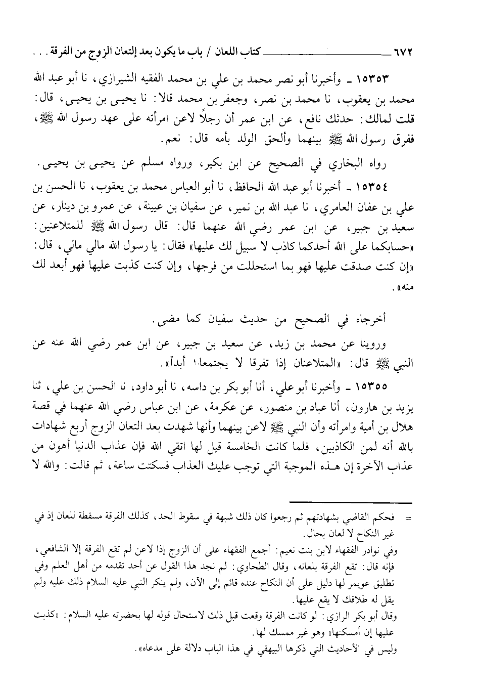 15353 - وَأَخْبَرَنَا أَبُو نَصْرٍ مُحَمَّدُ بْنُ عَلِيِّ بْنِ مُحَمَّدٍ الْفَقِيهُ الشِّيرَازِيُّ نا أَبُو عَبْدِ اللهِ مُحَمَّدُ بْنُ يَعْقُوبَ نا مُحَمَّدُ بْنُ نَصْرٍ، وَجَعْفَرُ بْنُ مُحَمَّدٍ قَالَا: نا يَحْيَى بْنُ يَحْيَى قَالَ: قُلْتُ لِمَالِكٍ: حَدَّثَكَ نَافِعٌ، عَنِ ابْنِ عُمَرَ أَنَّ §رَجُلًا لَاعَنَ امْرَأَتَهُ عَلَى عَهْدِ رَسُولِ اللهِ صَلَّى اللهُ عَلَيْهِ وَسَلَّمَ " فَفَرَّقَ رَسُولُ اللهِ صَلَّى اللهُ عَلَيْهِ وَسَلَّمَ بَيْنَهُمَا وَأَلْحَقَ الْوَلَدَ بِأُمِّهِ؟ " قَالَ: نَعَمْ رَوَاهُ الْبُخَارِيُّ فِي الصَّحِيحِ عَنِ ابْنِ بُكَيْرٍ، وَرَوَاهُ مُسْلِمٌ عَنْ يَحْيَى بْنِ يَحْيَى