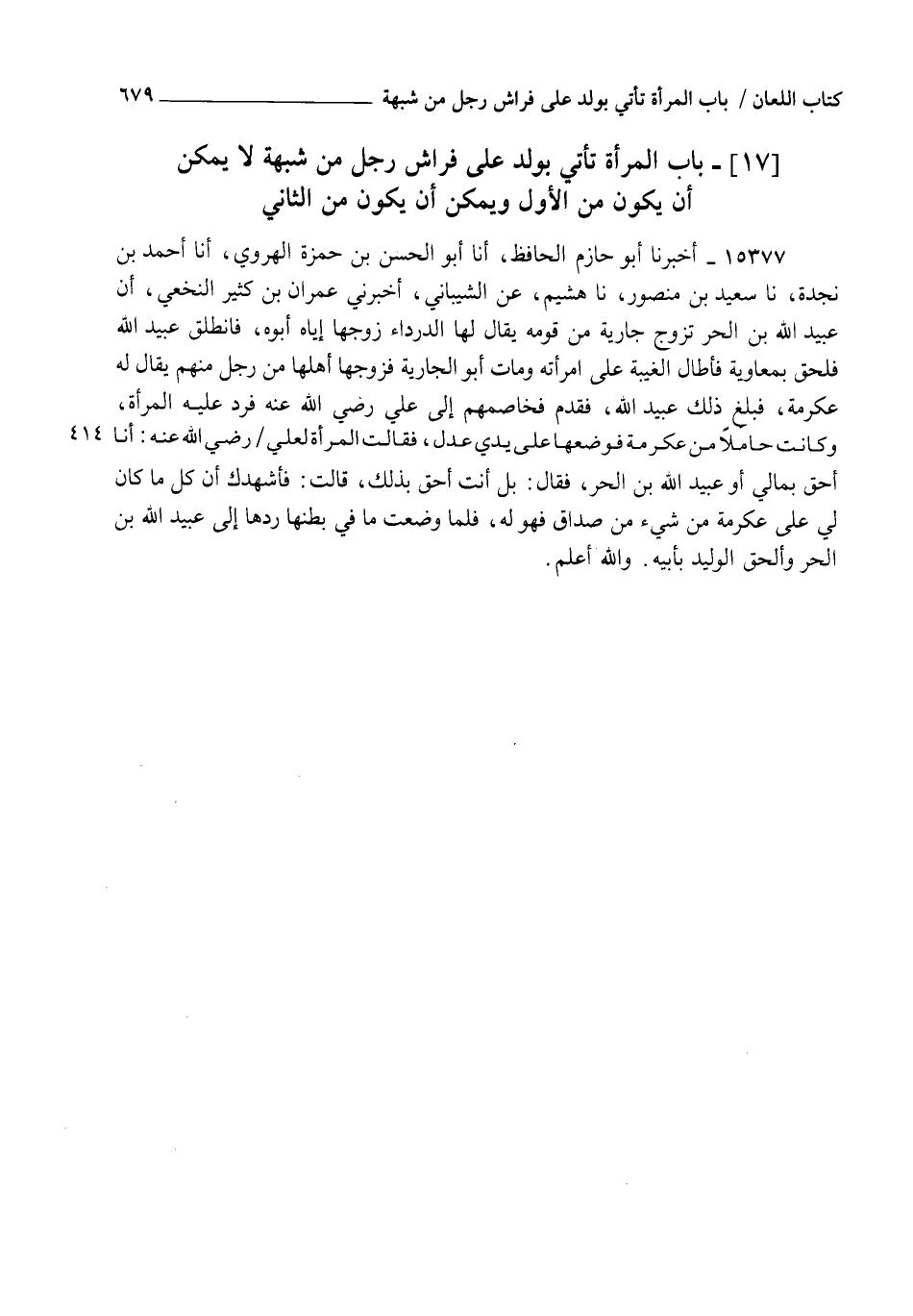 15377 - أَخْبَرَنَا أَبُو حَازِمٍ الْحَافِظُ، أنا أَبُو الْحَسَنِ بْنُ حَمْزَةَ الْهَرَوِيُّ، أنا أَحْمَدُ بْنُ نَجْدَةَ، نا سَعِيدُ بْنُ مَنْصُورٍ، نا هُشَيْمٌ، عَنِ الشَّيْبَانِيِّ، أَخْبَرَنِي عِمْرَانُ بْنُ كَثِيرٍ النَّخَعِيُّ، أَنَّ عُبَيْدَ اللهِ بْنَ الْحُرِّ، تَزَوَّجَ جَارِيَةً مِنْ قَوْمِهِ يُقَالُ لَهَا الدَّرْدَاءُ زَوَّجَهَا إِيَّاهُ أَبُوهَا فَانْطَلَقَ عُبَيْدُ اللهِ فَلَحِقَ بِمُعَاوِيَةَ فَأَطَالَ الْغَيْبَةَ عَلَى امْرَأَتِهِ وَمَاتَ أَبُو الْجَارِيَةِ فَزَوَّجَهَا أَهْلُهَا مِنْ رَجُلٍ مِنْهُمْ يُقَالُ لَهُ عِكْرِمَةُ فَبَلَغَ ذَلِكَ عُبَيْدَ اللهِ فَقَدِمَ فَخَاصَمَهُمْ إِلَى عَلِيٍّ رَضِيَ اللهُ عَنْهُ §" فَرَدَّ عَلَيْهِ الْمَرْأَةَ وَكَانَتْ حَامِلًا مِنْ عِكْرِمَةَ فَوَضَعَهَا عَلَى يَدَيْ عَدْلٍ " , فَقَالَتِ الْمَرْأَةُ لِعَلِيٍّ رَضِيَ اللهُ عَنْهُ أَنَا أَحَقُّ بِمَالِي أَوْ عُبَيْدُ اللهِ بْنُ الْحُرِّ؟ فَقَالَ: " بَلْ أَنْتَ أَحَقُّ بِذَلِكَ " , قَالَتْ: فَأُشْهِدُكَ أَنَّ كُلَّ مَا كَانَ لِي عَلَى عِكْرِمَةَ مِنْ شَيْءٍ مِنْ صَدَاقٍ فَهُوَ لَهُ، فَلَمَّا وَضَعَتْ مَا فِي بَطْنِهَا رَدَّهَا إِلَى عُبَيْدِ اللهِ بْنِ الْحُرِّ وَأَلْحَقَ الْوَلِيدَ بِأَبِيهِ، وَاللهُ أَعْلَمُ