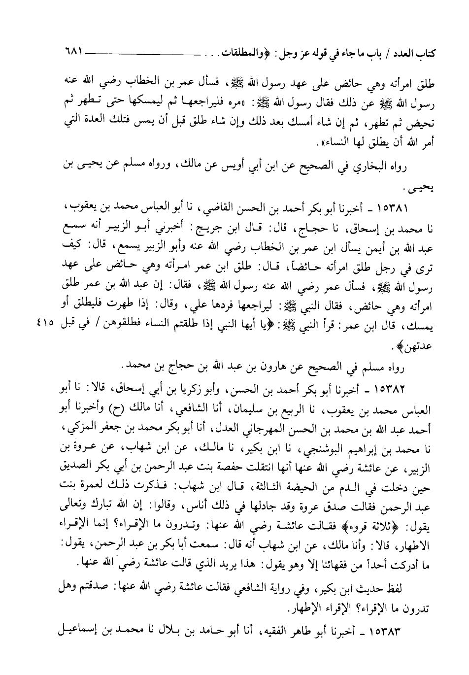 15381 - أَخْبَرَنَا أَبُو بَكْرٍ أَحْمَدُ بْنُ الْحَسَنِ الْقَاضِي نا أَبُو الْعَبَّاسِ مُحَمَّدُ بْنُ يَعْقُوبَ نا مُحَمَّدُ بْنُ إِسْحَاقَ، نا حَجَّاجٌ قَالَ: قَالَ ابْنُ جُرَيْجٍ: أَخْبَرَنِي أَبُو الزُّبَيْرِ أَنَّهُ سَمِعَ عَبْدَ الرَّحْمَنِ بْنَ أَيْمَنَ يَسْأَلُ ابْنَ عُمَرَ بْنِ الْخَطَّابِ رَضِيَ اللهُ عَنْهُ وَأَبُو الزُّبَيْرِ يَسْمَعُ قَالَ: كَيْفَ تَرَى فِي رَجُلٍ طَلَّقَ امْرَأَتَهُ حَائِضًا؟ قَالَ: طَلَّقَ ابْنُ عُمَرَ امْرَأَتَهُ وَهِيَ حَائِضٌ عَلَى عَهْدِ رَسُولِ اللهِ صَلَّى اللهُ عَلَيْهِ وَسَلَّمَ فَسَأَلَ عُمَرُ رَضِيَ اللهُ عَنْهُ رَسُولَ اللهِ صَلَّى اللهُ عَلَيْهِ وَسَلَّمَ فَقَالَ: إِنَّ عَبْدَ اللهِ بْنَ عُمَرَ طَلَّقَ امْرَأَتَهُ وَهِيَ حَائِضٌ , فَقَالَ النَّبِيُّ صَلَّى اللهُ عَلَيْهِ وَسَلَّمَ: " لِيُرَاجِعْهَا " فَرَدَّهَا عَلَيَّ وَقَالَ: " §إِذَا طَهُرَتْ فَلْيُطَلِّقْ أَوْ يُمْسِكْ " قَالَ ابْنُ عُمَرَ: قَرَأَ النَّبِيُّ صَلَّى اللهُ عَلَيْهِ وَسَلَّمَ: " يَا أَيُّهَا النَّبِيُّ إِذَا طَلَّقْتُمُ النِّسَاءَ فَطَلِّقُوهُنَّ فِي قُبُلِ عِدَّتِهِنَّ " رَوَاهُ مُسْلِمٌ فِي الصَّحِيحِ، عَنْ هَارُونَ بْنِ عَبْدِ اللهِ بْنِ حَجَّاجِ بْنِ مُحَمَّدٍ