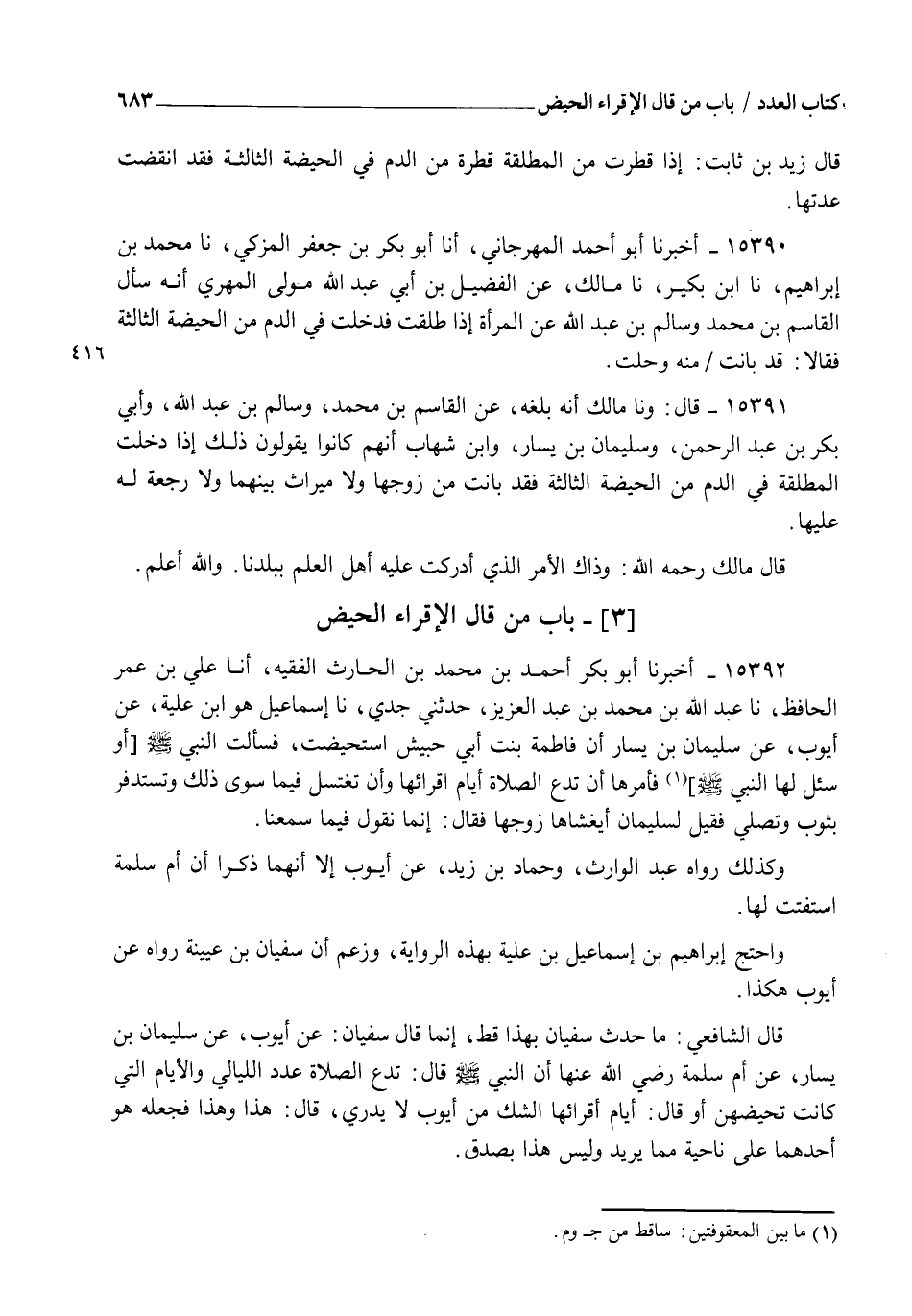 15391 - قَالَ: وَنا مَالِكٌ أَنَّهُ بَلَغَهُ عَنِ الْقَاسِمِ بْنِ مُحَمَّدٍ، وَسَالِمِ بْنِ عَبْدِ اللهِ، وَأَبِي بَكْرِ بْنِ عَبْدِ الرَّحْمَنِ وَسُلَيْمَانَ بْنِ يَسَارٍ وَابْنِ شِهَابٍ أَنَّهُمْ كَانُوا يَقُولُونَ ذَلِكَ §" إِذَا دَخَلَتِ الْمُطَلَّقَةُ فِي الدَّمِ مِنَ الْحَيْضَةِ الثَّالِثَةِ فَقَدْ بَانَتْ مِنْ زَوْجِهَا وَلَا مِيرَاثَ بَيْنَهُمَا وَلَا رَجْعَةَ لَهُ عَلَيْهَا " قَالَ مَالِكٌ رَحِمَهُ اللهُ: وَذَاكَ الْأَمْرُ الَّذِي أَدْرَكْتُ عَلَيْهِ أَهْلَ الْعِلْمِ بِبَلَدِنَا وَاللهُ أَعْلَمُ