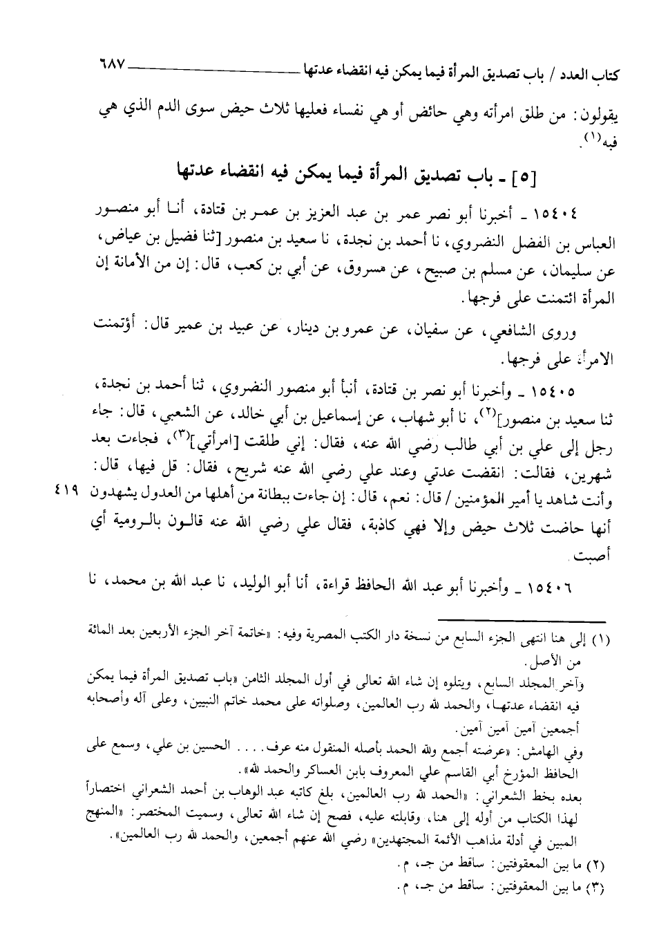 15406 - وَأَخْبَرَنَا أَبُو عَبْدِ اللهِ الْحَافِظُ قِرَاءَةً أنا أَبُو الْوَلِيدِ، نا عَبْدُ اللهِ بْنُ مُحَمَّدٍ، نا -[688]- حُمَيْدُ بْنُ مَسْعَدَةَ، نا خَالِدُ بْنُ الْحَارِثِ، عَنْ سَعِيدٍ، عَنْ قَتَادَةَ، عَنْ عَزْرَةَ، عَنِ الْحَسَنِ الْعُرَنِيِّ، أَنَّ شُرَيْحًا رُفِعَتْ إِلَيْهِ امْرَأَةٌ طَلَّقَهَا زَوْجُهَا فَحَاضَتْ فِي خَمْسٍ وَثَلَاثِينَ لَيْلَةً ثَلَاثَ حِيَضٍ فَذَكَرَ نَحْوَ حَدِيثِ الشَّعْبِيِّ فَرَفَعَ ذَلِكَ شُرَيْحٌ إِلَى عَلِيِّ بْنِ أَبِي طَالِبٍ رَضِيَ اللهُ عَنْهُ فَقَالَ: §" سَلُوا عَنْهَا جَارَاتِهَا فَإِنْ كَانَ حَيْضُهَا كَذَا انْقَضَتْ عِدَّتُهَا " وَذَكَرَ الْحَدِيثَ