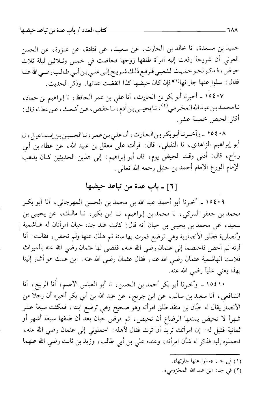 15409 - أَخْبَرَنَا أَبُو أَحْمَدَ عَبْدُ اللهِ بْنُ مُحَمَّدِ بْنِ الْحَسَنِ الْمِهْرَجَانِيُّ، أنا أَبُو بَكْرٍ مُحَمَّدُ بْنُ جَعْفَرٍ الْمُزَكِّي نا مُحَمَّدُ بْنُ إِبْرَاهِيمَ، نا ابْنُ بُكَيْرٍ، نا مَالِكٌ، عَنْ يَحْيَى بْنِ سَعِيدٍ، عَنْ مُحَمَّدِ بْنِ يَحْيَى بْنِ حَبَّانَ أَنَّهُ قَالَ: " كَانَتْ عِنْدَ جَدِّهِ حَبَّانَ امْرَأَتَانِ لَهُ هَاشِمِيَّةٌ وَأَنْصَارِيَّةٌ فَطَلَّقَ الْأَنْصَارِيَّةَ وَهِيَ تُرْضِعُ فَمَرَّتْ بِهَا سَنَةٌ ثُمَّ هَلَكَ عَنْهَا وَلَمْ تَحِضْ , فَقَالَتْ: §أَنَا أَرِثُهُ لَمْ أَحِضْ فَاخْتَصَمَا إِلَى عُثْمَانَ رَضِيَ اللهُ عَنْهُ " فَقَضَى لَهَا عُثْمَانُ رَضِيَ اللهُ عَنْهُ بِالْمِيرَاثِ " فَلَامَتِ الْهَاشِمِيَّةُ عُثْمَانَ رَضِيَ اللهُ عَنْهُ فَقَالَ عُثْمَانُ رَضِيَ اللهُ عَنْهُ: ابْنُ عَمِّكِ هُوَ أَشَارَ إِلَيْنَا بِهَذَا يَعْنِي عَلِيًّا رَضِيَ اللهُ عَنْهُ "