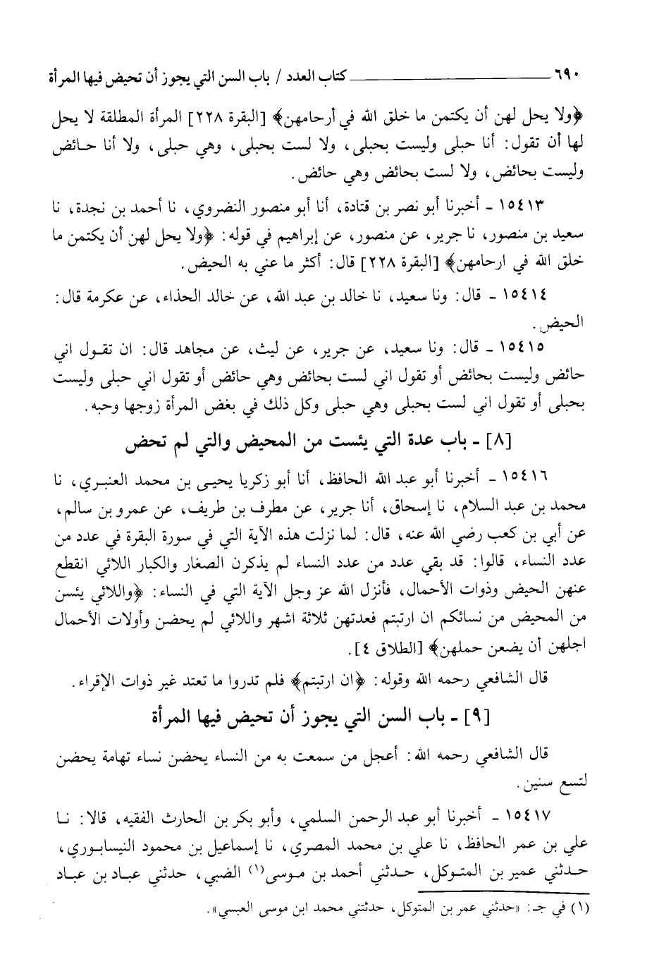 15413 - أَخْبَرَنَا أَبُو نَصْرِ بْنُ قَتَادَةَ، أنا أَبُو مَنْصُورٍ النَّضْرَوِيُّ، نا أَحْمَدُ بْنُ نَجْدَةَ، نا سَعِيدُ بْنُ مَنْصُورٍ، نا جَرِيرٌ، عَنْ مَنْصُورٍ، عَنْ إِبْرَاهِيمَ فِي قَوْلِهِ: {§وَلَا يَحِلُّ لَهُنَّ أَنْ يَكْتُمْنَ مَا خَلَقَ اللهُ فِي أَرْحَامِهِنَّ} [البقرة: 228] قَالَ: " أَكْثَرُ مَا عُنِيَ بِهِ الْحَيْضُ "