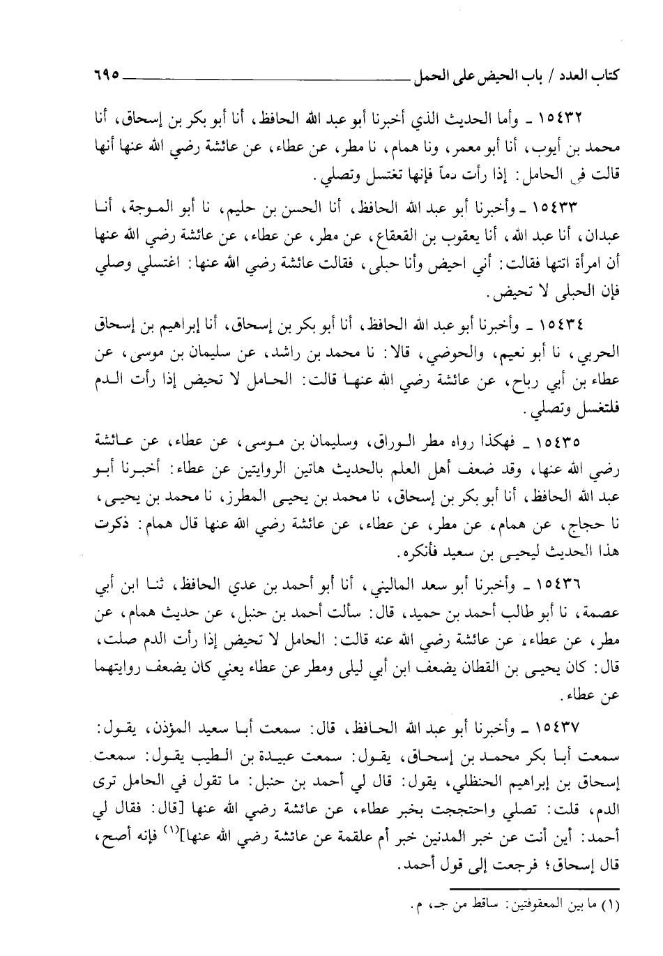 15436 - وَأَخْبَرَنَا أَبُو سَعْدٍ الْمَالِينِيُّ، أَنَا أَبُو أَحْمَدَ بْنُ عَدِيٍّ الْحَافِظُ، ثنا ابْنُ أَبِي عِصْمَةَ، نا أَبُو طَالِبٍ أَحْمَدُ بْنُ حُمَيْدٍ قَالَ: سَأَلْتُ أَحْمَدَ بْنَ حَنْبَلٍ عَنْ حَدِيثِ هَمَّامٍ، عَنْ مَطَرٍ، عَنْ عَطَاءٍ، عَنْ عَائِشَةَ رَضِيَ اللهُ عَنْهَا قَالَتْ: " الْحَامِلُ لَا تَحِيضُ إِذَا رَأَتِ الدَّمَ صَلَّتْ " قَالَ: كَانَ يَحْيَى يَعْنِي الْقَطَّانَ يُضَعِّفُ ابْنَ أَبِي لَيْلَى وَمَطَرًا عَنْ عَطَاءٍ يَعْنِي كَانَ يُضَعِّفُ رِوَايَتَهُمَا عَنْ عَطَاءٍ