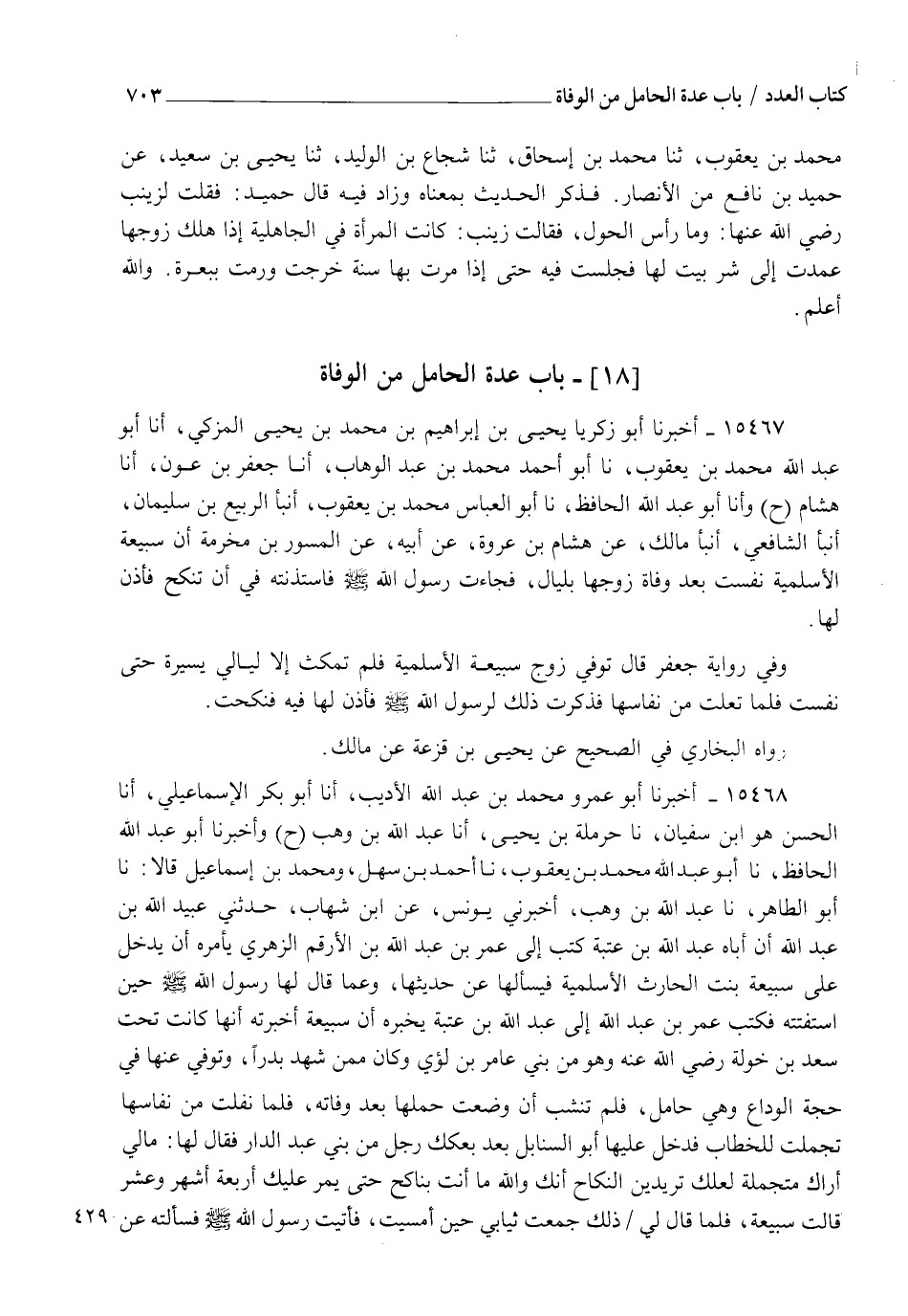15468 - أَخْبَرَنَا أَبُو عَمْرٍو مُحَمَّدُ بْنُ عَبْدِ اللهِ الْأَدِيبُ أنا أَبُو بَكْرٍ الْإِسْمَاعِيلِيُّ، أنا الْحَسَنُ هُوَ ابْنُ سُفْيَانَ نا حَرْمَلَةُ بْنُ يَحْيَى، أنا عَبْدُ اللهِ بْنُ وَهْبٍ، ح وَأَخْبَرَنَا أَبُو عَبْدِ اللهِ الْحَافِظُ، نا أَبُو عَبْدِ اللهِ مُحَمَّدُ بْنُ يَعْقُوبَ نا أَحْمَدُ بْنُ سَهْلٍ، وَمُحَمَّدُ بْنُ إِسْمَاعِيلَ قَالَا: نا أَبُو الطَّاهِرِ، نا عَبْدُ اللهِ بْنُ وَهْبٍ، أَخْبَرَنِي يُونُسُ، عَنِ ابْنِ شِهَابٍ، حَدَّثَنِي عُبَيْدُ اللهِ بْنُ عَبْدِ اللهِ، أَنَّ أَبَاهُ عَبْدَ اللهِ بْنَ عُتْبَةَ، كَتَبَ إِلَى عُمَرَ بْنِ عَبْدِ اللهِ بْنِ الْأَرْقَمِ الزُّهْرِيِّ يَأْمُرُهُ أَنْ يَدْخُلَ عَلَى سُبَيْعَةَ بِنْتِ الْحَارِثِ الْأَسْلَمِيَّةِ فَيَسْأَلَهَا عَنْ حَدِيثِهَا وَعَمَّا قَالَ لَهَا رَسُولُ اللهِ صَلَّى اللهُ عَلَيْهِ وَسَلَّمَ حِينَ اسْتَفْتَتْهُ فَكَتَبَ عُمَرُ بْنُ عَبْدِ اللهِ إِلَى عَبْدِ اللهِ بْنِ عُتْبَةَ يُخْبِرُهُ أَنَّ سُبَيْعَةَ أَخْبَرَتْهُ أَنَّهَا كَانَتْ تَحْتَ سَعْدِ بْنِ خَوْلَةَ رَضِيَ اللهُ عَنْهُ , وَهُوَ مِنْ بَنِي عَامِرِ بْنِ لُؤَيٍّ وَكَانَ مِمَّنْ شَهِدَ بَدْرًا وَتُوُفِّيَ عَنْهَا فِي حَجَّةِ الْوَدَاعِ وَهِيَ حَامِلٌ فَلَمْ تَنْشَبْ أَنْ وَضَعَتْ حَمْلَهَا بَعْدَ وَفَاتِهِ، فَلَمَّا تَعَلَّتْ مِنْ نِفَاسِهَا تَجَمَّلَتْ لِلْخُطَّابِ فَدَخَلَ عَلَيْهَا أَبُو السَّنَابِلِ بْنُ بَعْكَكٍ رَجُلٌ مِنْ بَنِي عَبْدِ الدَّارِ فَقَالَ لَهَا: مَالِي أَرَاكِ مُتَجَمِّلَةً لَعَلَّكِ تُرِيدِينَ النِّكَاحَ إِنَّكِ وَاللهِ مَا أَنْتِ بِنَاكِحٍ حَتَّى يَمُرَّ عَلَيْكِ أَرْبَعَةُ أَشْهُرٍ وَعَشْرٌ قَالَتْ سُبَيْعَةُ: فَلَمَّا قَالَ لِي ذَلِكَ جَمَعْتُ ثِيَابِي حِينَ أَمْسَيْتُ فَأَتَيْتُ رَسُولَ اللهِ صَلَّى اللهُ عَلَيْهِ وَسَلَّمَ فَسَأَلْتُهُ عَنْ -[704]- ذَلِكَ فَأَفْتَانِي §" بِأَنِّي قَدْ حَلَلْتُ حِينَ وَضَعْتُ حَمْلِي فَأَمَرَنِي بِالتَّزْوِيجِ إِنْ بَدَا لِي " زَادَ أَبُو عَمْرٍو فِي رِوَايَتِهِ قَالَ ابْنُ شِهَابٍ: فَلَا أَرَى بَأْسًا أَنْ تَتَزَوَّجَ حِينَ وَضَعَتْ وَإِنْ كَانَتْ فِي دَمِهَا غَيْرَ أَنَّهُ لَا يَقْرَبُهَا زَوْجُهَا حَتَّى تَطْهُرَ , لَفْظُ حَدِيثِ حَرْمَلَةَ رَوَاهُ مُسْلِمٌ فِي الصَّحِيحِ، عَنْ أَبِي الطَّاهِرِ وَحَرْمَلَةَ، وَأَخْرَجَهُ الْبُخَارِيُّ، مِنْ حَدِيثِ اللَّيْثِ بْنِ سَعْدٍ عَنْ يُونُسَ، ثُمَّ قَالَ: وَتَابَعَهُ ابْنُ وَهْبٍ عَنْ يُونُسَ