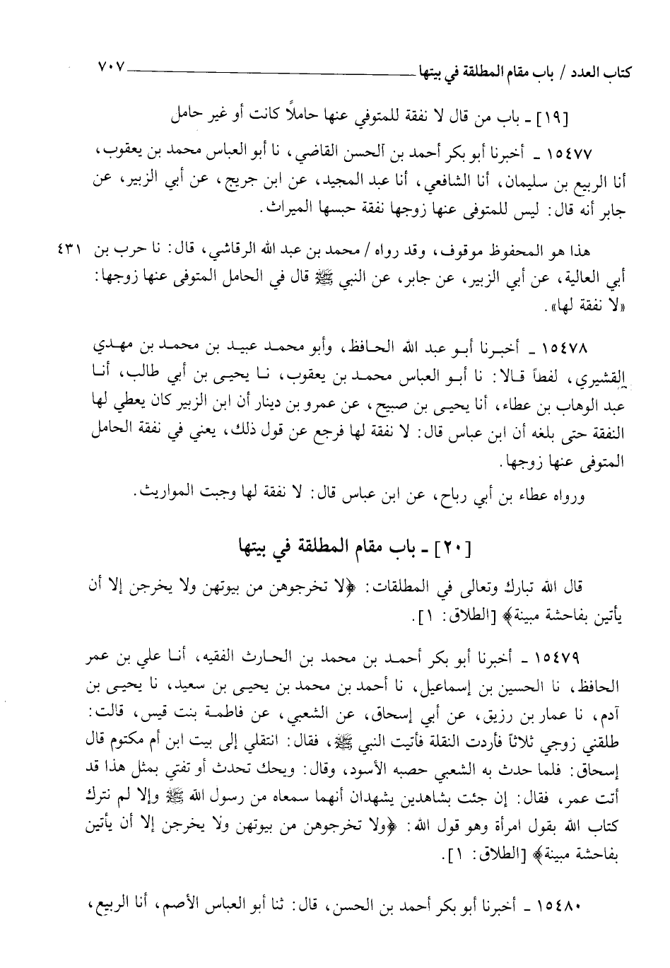 15479 - أَخْبَرَنَا أَبُو بَكْرٍ أَحْمَدُ بْنُ مُحَمَّدِ بْنِ الْحَارِثِ الْفَقِيهُ أنا عَلِيُّ بْنُ عُمَرَ الْحَافِظُ، نا الْحُسَيْنُ بْنُ إِسْمَاعِيلَ، نا أَحْمَدُ بْنُ مُحَمَّدِ بْنِ يَحْيَى بْنِ سَعِيدٍ، نا يَحْيَى بْنُ آدَمَ، نا عَمَّارُ بْنُ رُزَيْقٍ، عَنْ أَبِي إِسْحَاقَ، عَنِ الشَّعْبِيِّ، عَنْ فَاطِمَةَ بِنْتِ قَيْسٍ قَالَتْ: §طَلَّقَنِي زَوْجِي ثَلَاثًا فَأَرَدْتُ النُّقْلَةَ فَأَتَيْتُ النَّبِيَّ صَلَّى اللهُ عَلَيْهِ وَسَلَّمَ فَقَالَ: " انْتَقِلِي إِلَى بَيْتِ ابْنِ أُمِّ مَكْتُومٍ " قَالَ إِسْحَاقُ: فَلَمَّا حَدَّثَ بِهِ الشَّعْبِيُّ حَصَبَهُ الْأَسْوَدُ وَقَالَ وَيْحَكَ تُحَدِّثُ أَوْ تُفْتِي بِمِثْلِ هَذَا قَدْ أَتَتْ عُمَرَ فَقَالَ: " إِنْ جِئْتِ بِشَاهِدَيْنِ يَشْهَدَانِ أَنَّهُمَا سَمِعَاهُ مِنْ رَسُولِ اللهِ صَلَّى اللهُ عَلَيْهِ وَسَلَّمَ وَإِلَّا لَمْ نَتْرُكْ كِتَابَ اللهِ بِقَوْلِ امْرَأَةٍ وَهُوَ قَوْلُ اللهِ {لَا تُخْرِجُوهُنَّ مِنْ بُيُوتِهِنَّ وَلَا يَخْرُجْنَ إِلَّا أَنْ يَأْتِينَ بِفَاحِشَةٍ مُبَيِّنَةٍ} [الطلاق: 1] "